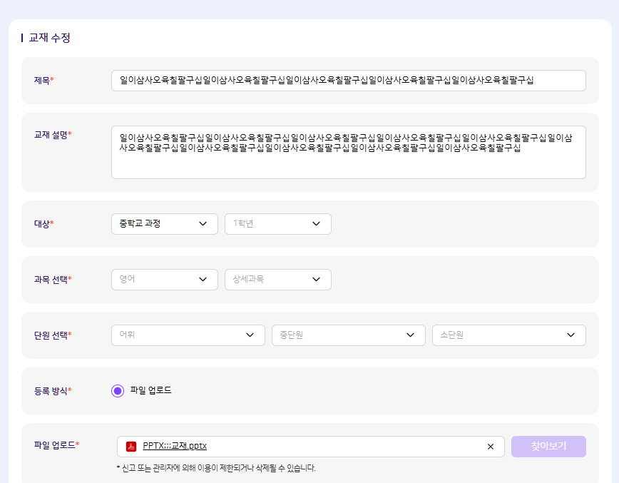 | Steps To Reproduce | 학습 콘텐츠 > 콘텐츠 등록 > 등록한 콘텐츠 수정하기 > 수정하기 화면 응시 | ||||
