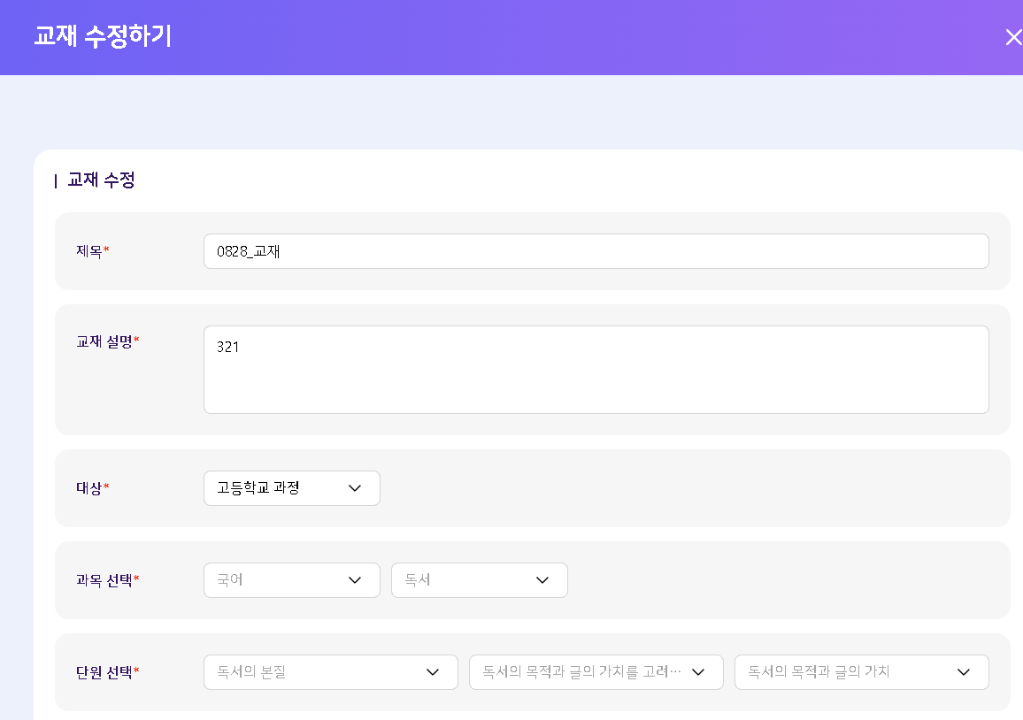 | Description | 콘텐츠 수정하기 - 신규 추가한 콘텐츠 수정하기시 기존에 선택했던 단원선택 노출 안되는 현상 기존에 선택했던 단원은 디폴트로 노출 되어야함. | ||||