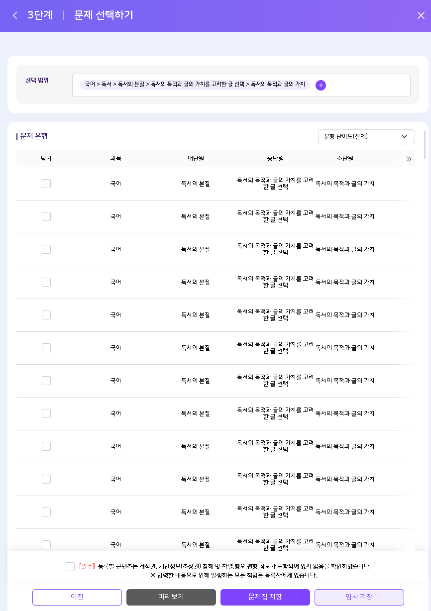 | Steps To Reproduce | 학습 콘텐츠 > 등록하기 > 선택,랜덤,서술형 문항 > 3단계 문제 선택하기 | ||||