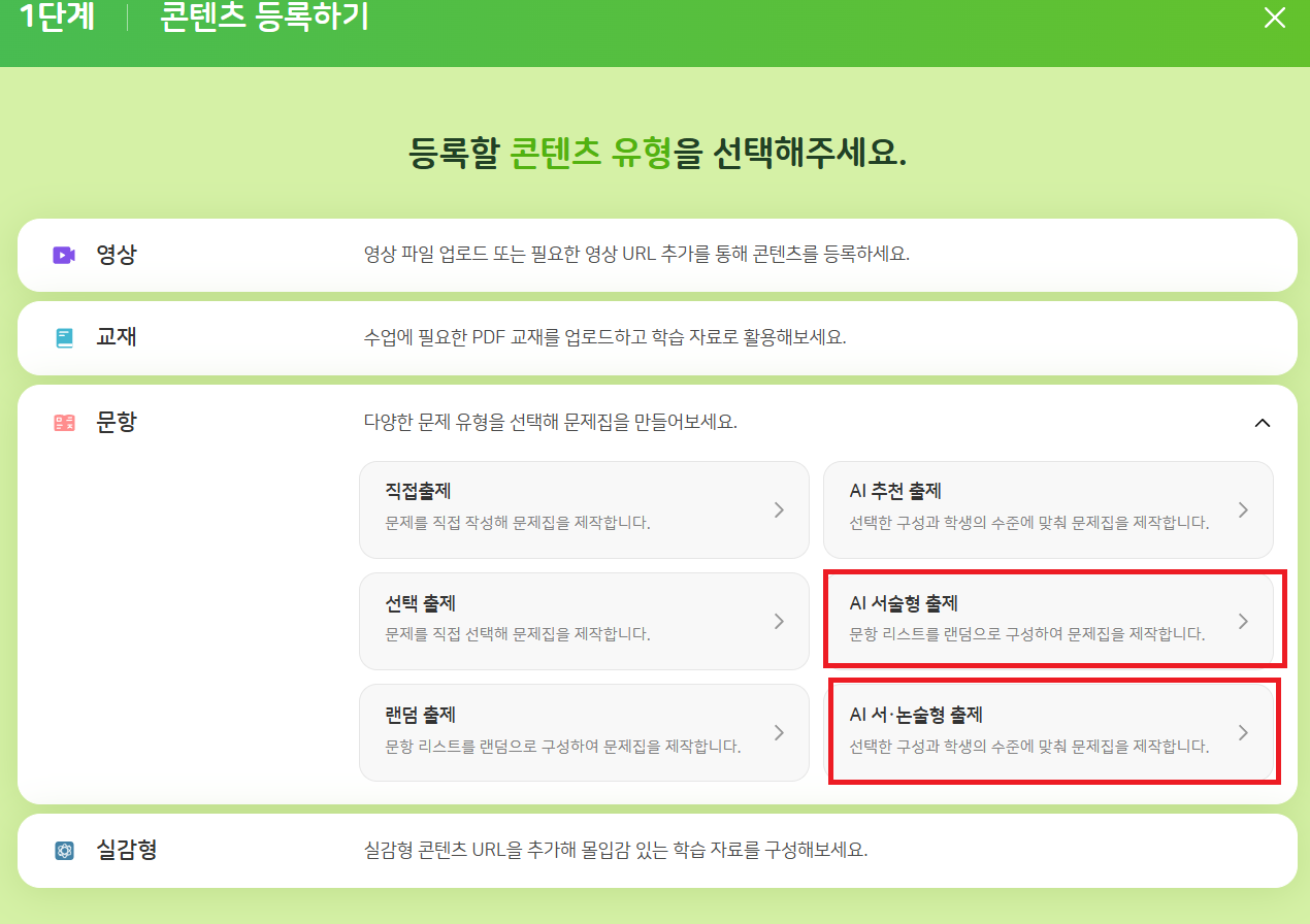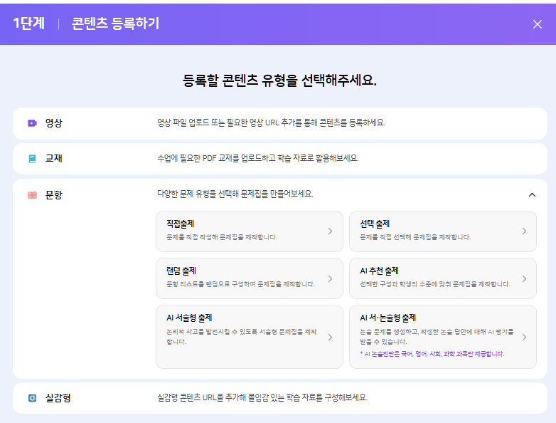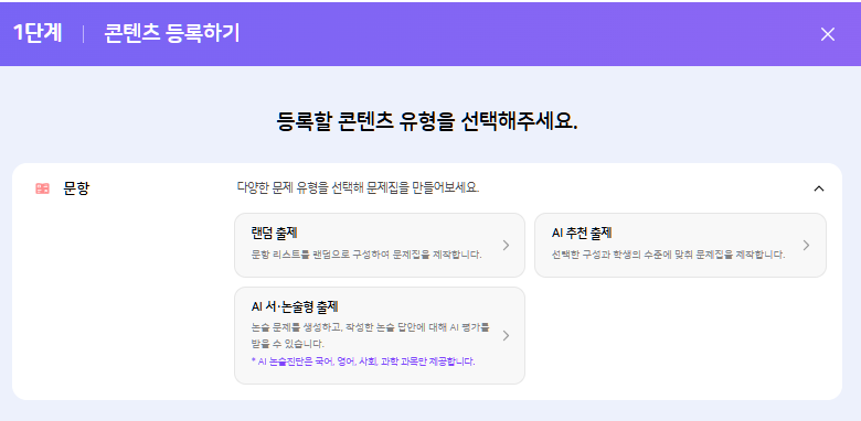 | Description | 콘텐츠 등록하기 - 문항 - 문구 내용 변경(교사/학생) AI 서술형 출제 서브 텍스트 : 논리적 사고를 발전시킬 수 있도록 서술형으로 문제집을 제작합니다. AI 서·논술형 출제 서브 텍스트 : 논술 문제를 생성하고, 작성한 논술 답안에 대해 AI 평가를 받을 수 있습니다. *AI 논술진단은 국어, 영어, 사회, 과학 과목만 제공합니다. | ||||