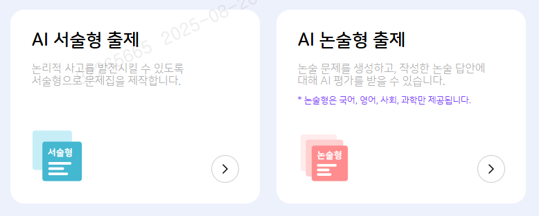 이슈1) 문구 수정 필요. AI 서술형 출제 서브 텍스트 : 논리적 사고를 발전시킬 수 있도록 서술형으로 문제집을 제작합니다. AI 서.논술형 출제 서브 텍스트 : 논술 문제를 생성하고, 작성한 논술 답안에 대해 AI 평가를 받을 수 있습니다. (+ 이슈1 의 퍼블 적용 요청) |