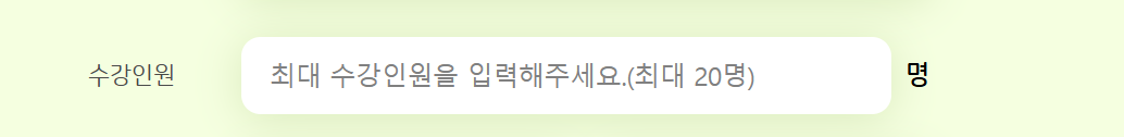 | Description | 기획(메일로만 확인) : 수강인원을 입력해 주세요(최대 20명) TB : 최대 수강인원을 입력해 주세요(최대 20명) | ||||