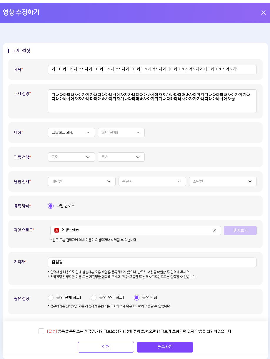 | Description | 영상, 교재 수정 시 [수정하기] 버튼이 [등록하기]로 노출되는 현상 "수정하기" 라고 노출 되어야함. | ||||
