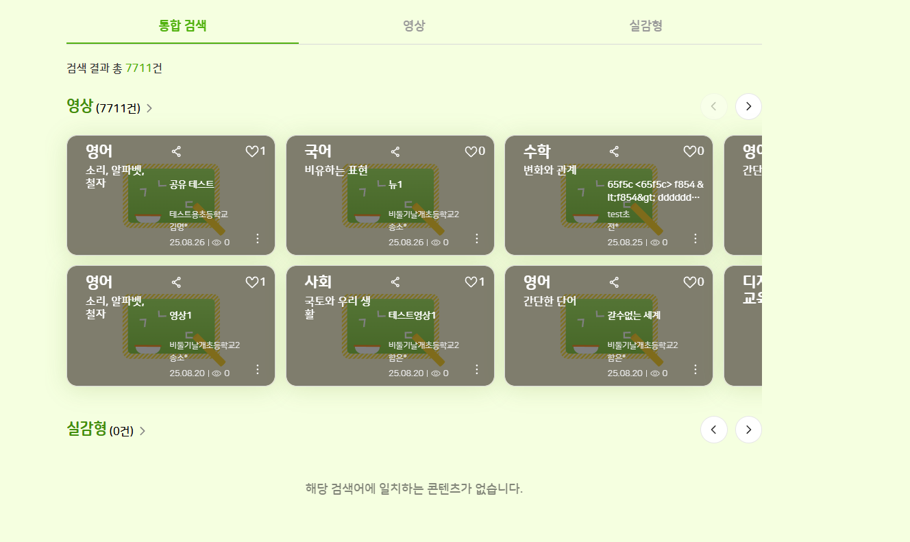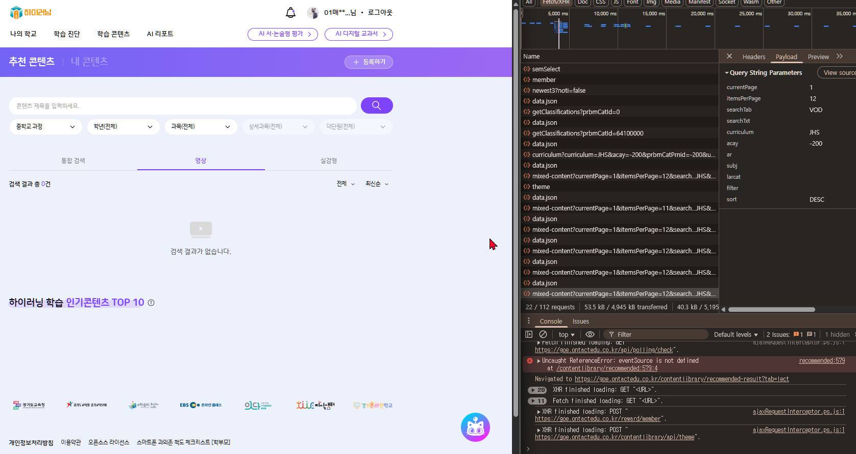 | Description | 학생 - 학습 콘텐츠 > 추천 콘텐츠 > 검색 영역에서 콘텐츠가 노출되지 않는 현상 | ||||