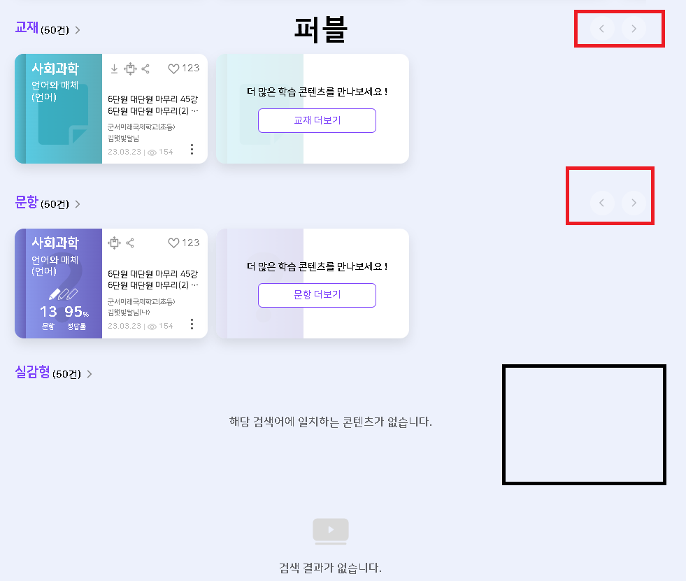 | Description | 추천 콘텐츠 > 검색 > 검색 결과 없음에 콘텐츠 영역 이동 버튼 활성화 "해당 검색어에 일치하는 콘텐츠가 없습니다." 에 < > 이동 버튼이 활성화 됩니다. | ||||