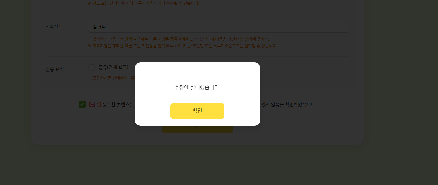 | Description | 영상 수정 시, 정상적으로 수정했음에도 수정 실패 팝업 노출되는 현상 *기대 결과 : 정상적으로 수정 시, "수정에 성공했습니다" 팝업 노출되어야 함 | ||||