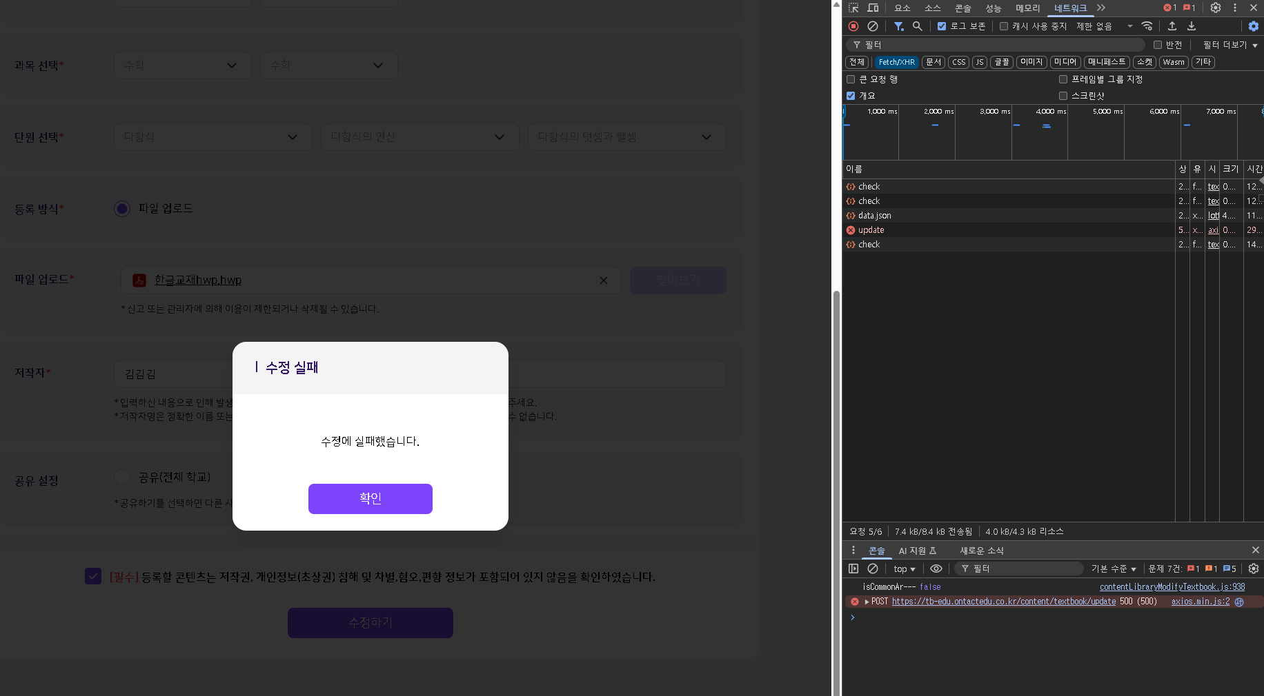 | Steps To Reproduce | 내 콘텐츠 > 교재 > 교재 수정 > 필수 동의 체크 > 수정하기 클릭 | ||||