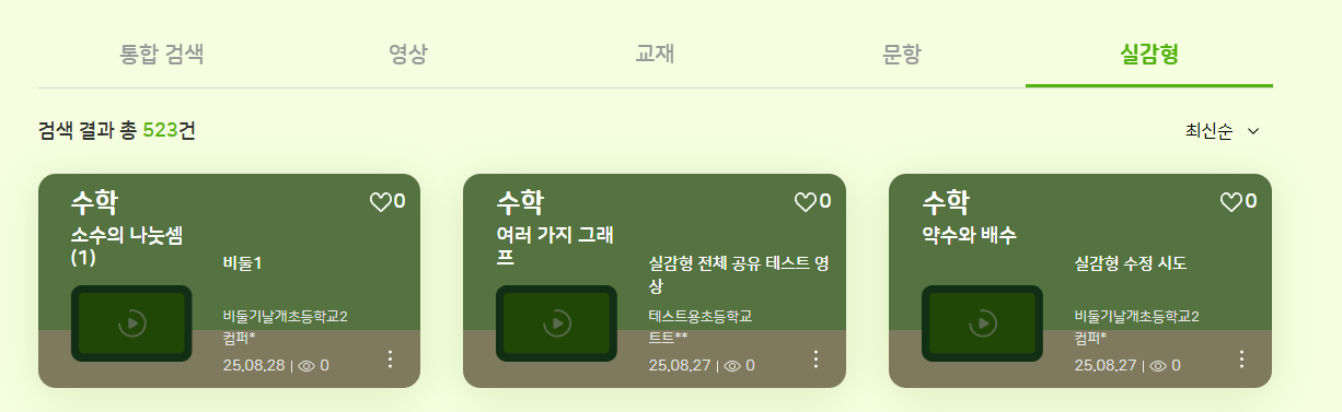 | Description | 실감형 콘텐츠 출처명이 모두 '실감형'으로 노출되는 현상 *기대결과 : CP사 콘텐츠인 경우 CP사 명 교사가 등록한 콘텐츠인 경우 다른 콘텐츠들과 같이 교사의 학교명, 교사 명 노출되어야 합니다. | ||||
