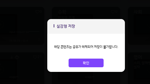 추천콘텐츠 - 실감형에 노출되는 (전체공유) 실감형 콘텐츠 저장 클릭 시 CP : 정상 저장 타교사 : 공유 해제 팝업 노출 해당 이슈 리오픈하겠습니다. |