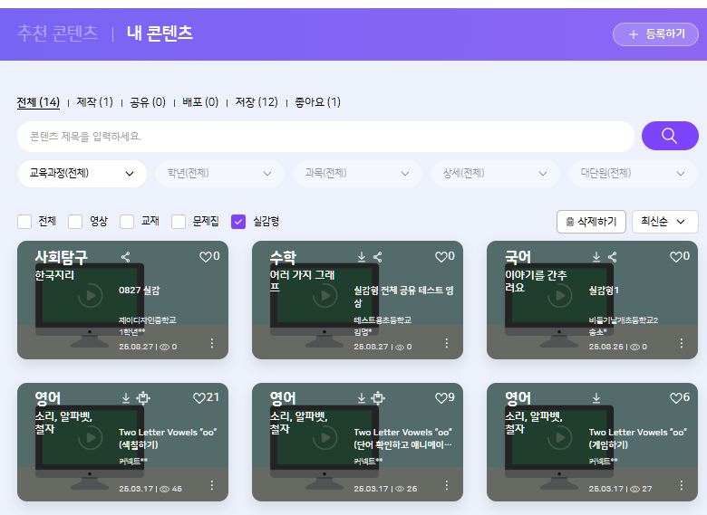 타교사 등록 실감형 콘텐츠 저장 확인 |