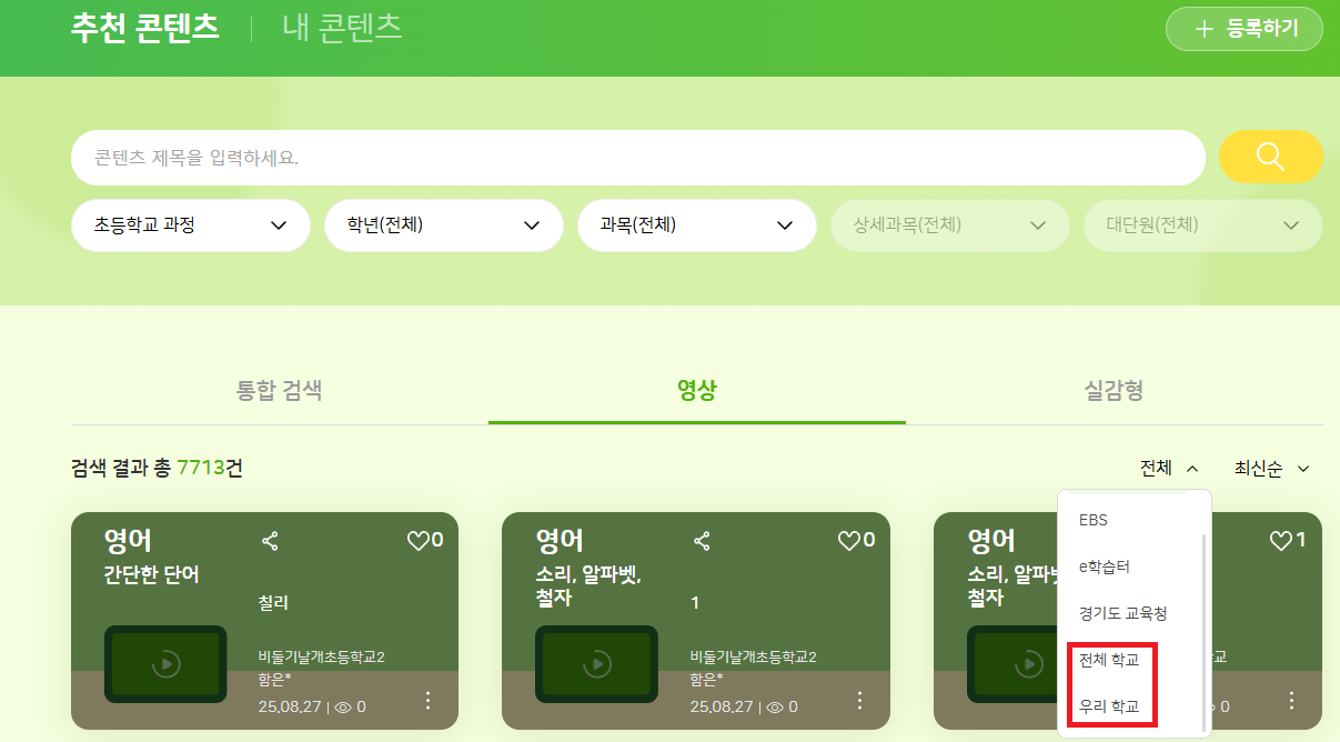 | Description | 학생 : 영상 탭의 필터에 전체 학교/우리 학교가 노출되는 현상 *기대결과 : 노출되면 안됨 | ||||