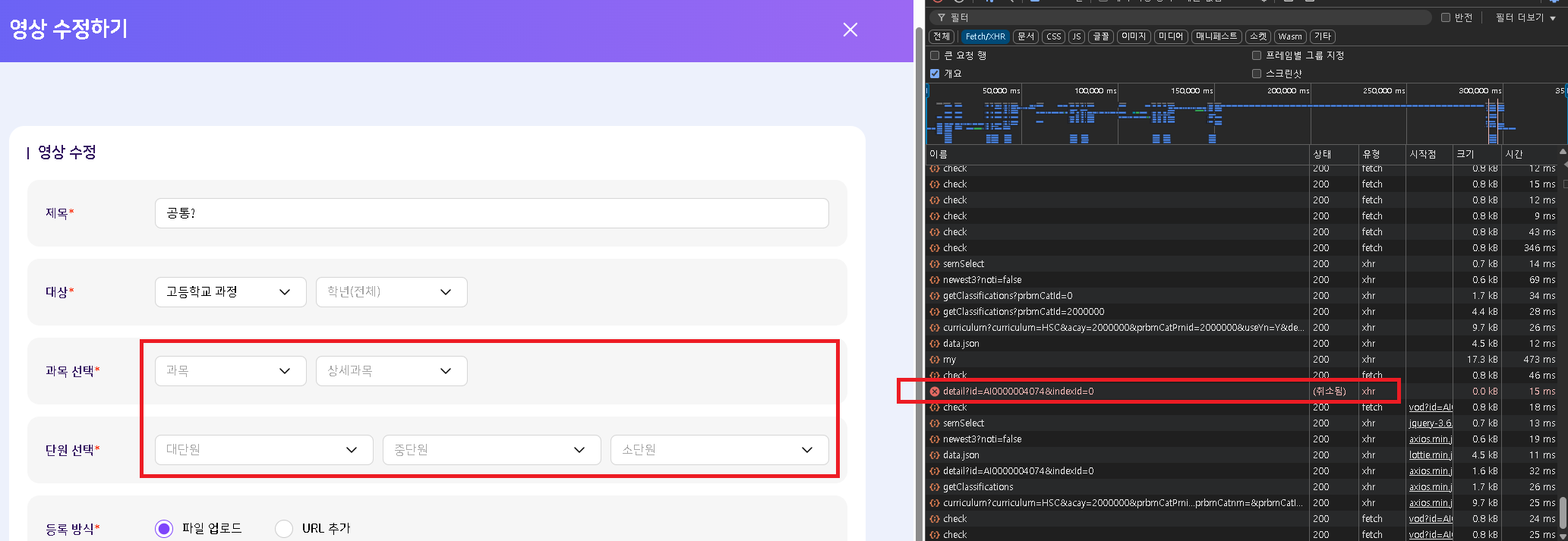 | Description | 영상 등록 - 고등학교 - 공통영어(고1) 로 등록시 영상 수정 화면에서 과목선택, 단원선택 불러오지 못하는 현상 발생 다른 과목-상세과목 선택시에는 저장 후 데이터 잘 불러오는데 영어 - 공통영어 선택시에는 이전에 선택한 데이터를 불러오지 못하는 현상입니다. | ||||