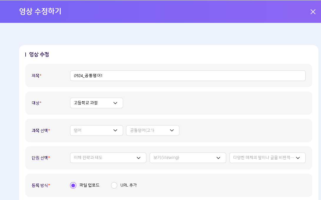 [조회] 상용 : 영상 필터 (고등,영어,공통영어1)로 영상 조회 가능 TB : 영상 필터 (고등, 영어, 공통영어1)로 영상 조회 가능 [수정] 상용 : 과목, 상세 과목 누락 / 재입력 시 정상 수정 가능 TB : 과목, 상세, 대단원, 중단원, 소단원 누락 / 재입력 시 정상 수정 가능 해당 이슈는 상용과 현상이 동일하다 판단되어 금번 배포에서 제외하겠습니다. |