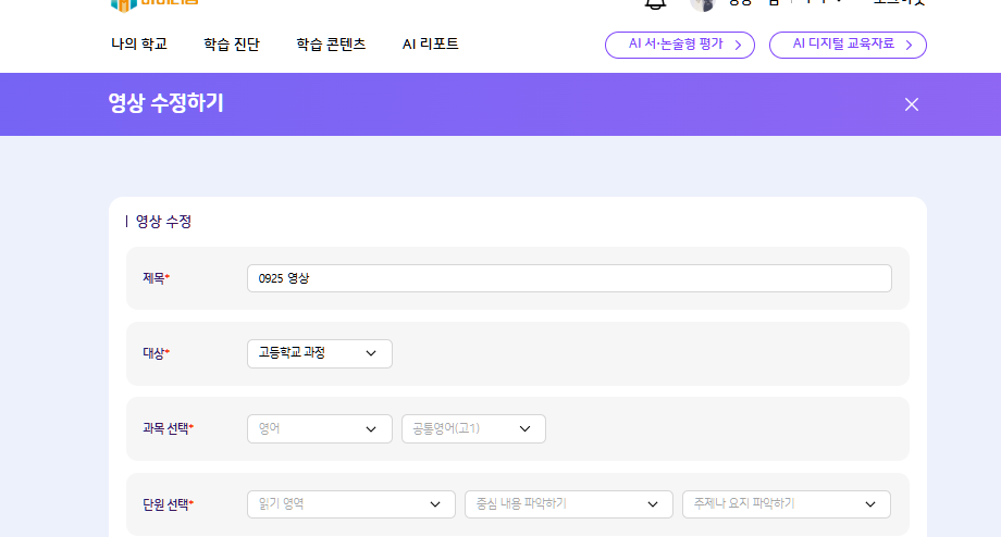 | Steps To Reproduce | 1. 학습 콘텐츠 > 등록 > 영상 등록 > 고등학교-영어-공통영어(고1) 선택 > 등록하기 버튼 클릭 2. 해당 영상 수정하기 클릭 > 응시 | ||||