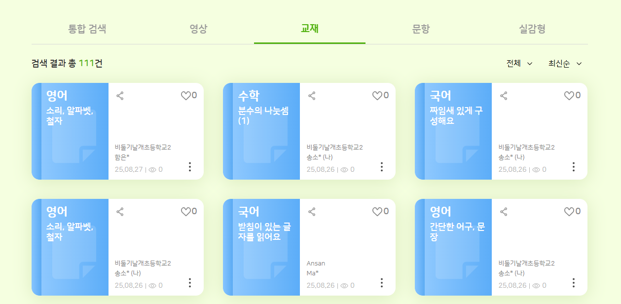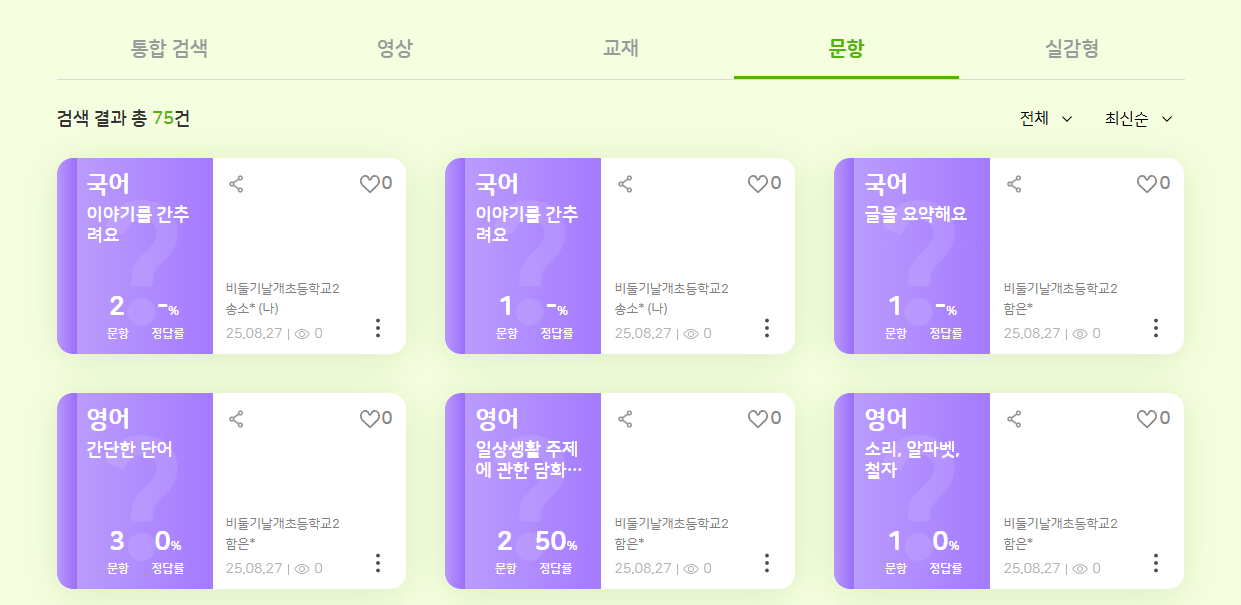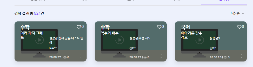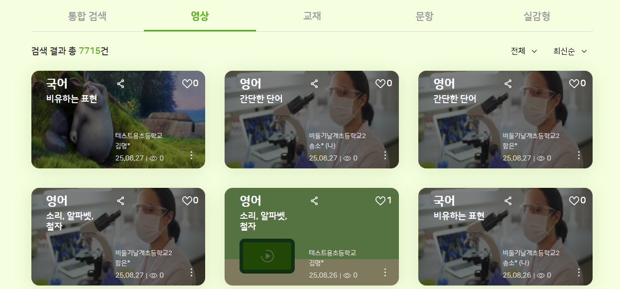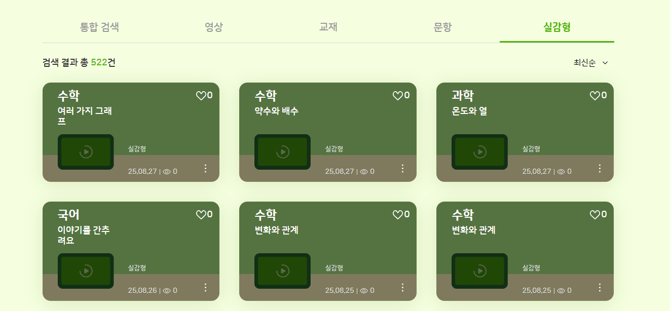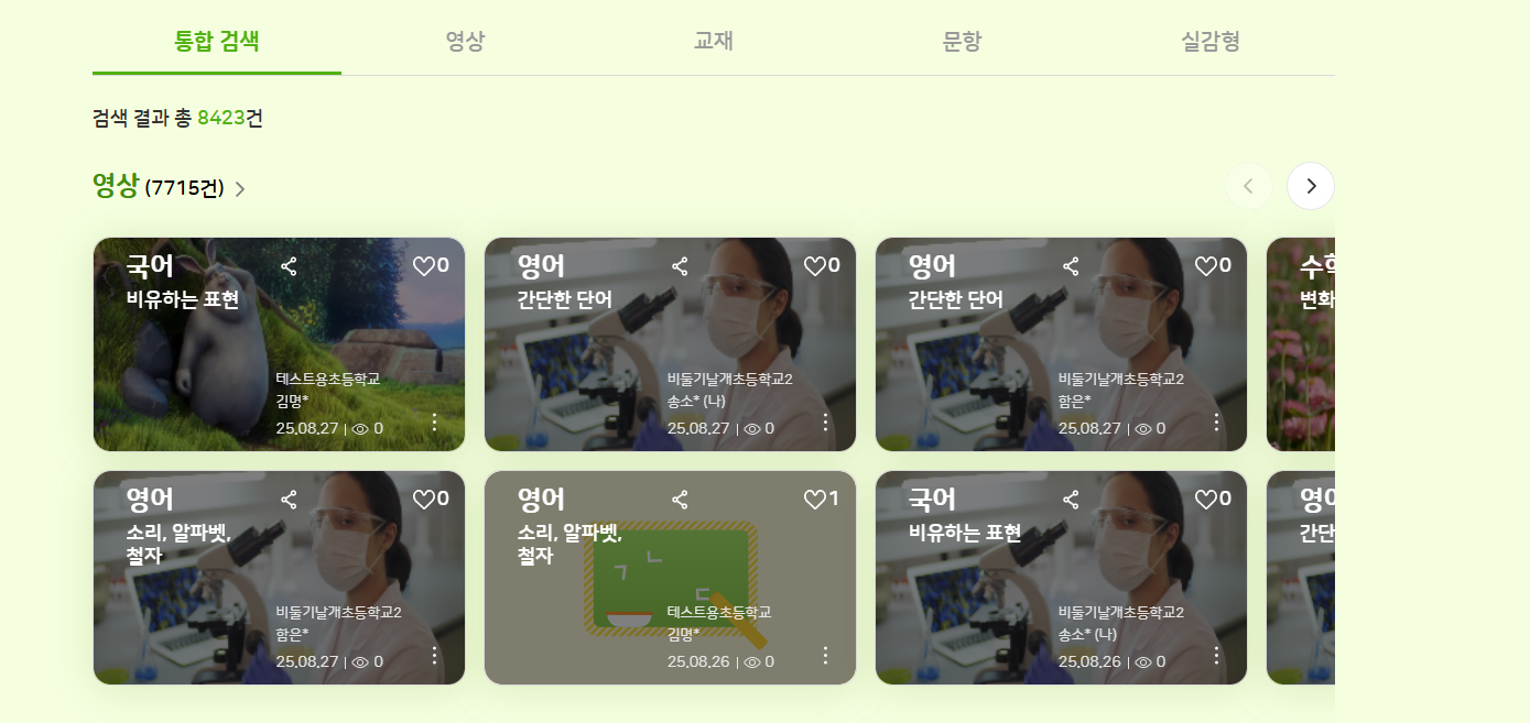 | Description | 추천 콘텐츠 > 통합검색 탭/영상 탭/교재 탭/문항 탭/실감형 탭 의 모든 콘텐츠 제목명 미노출 | ||||