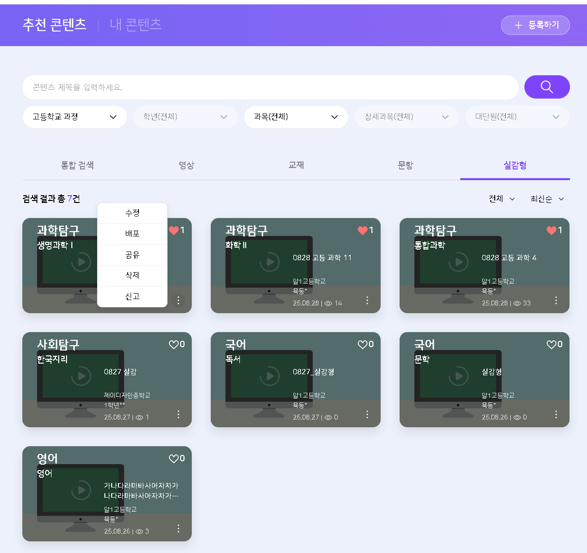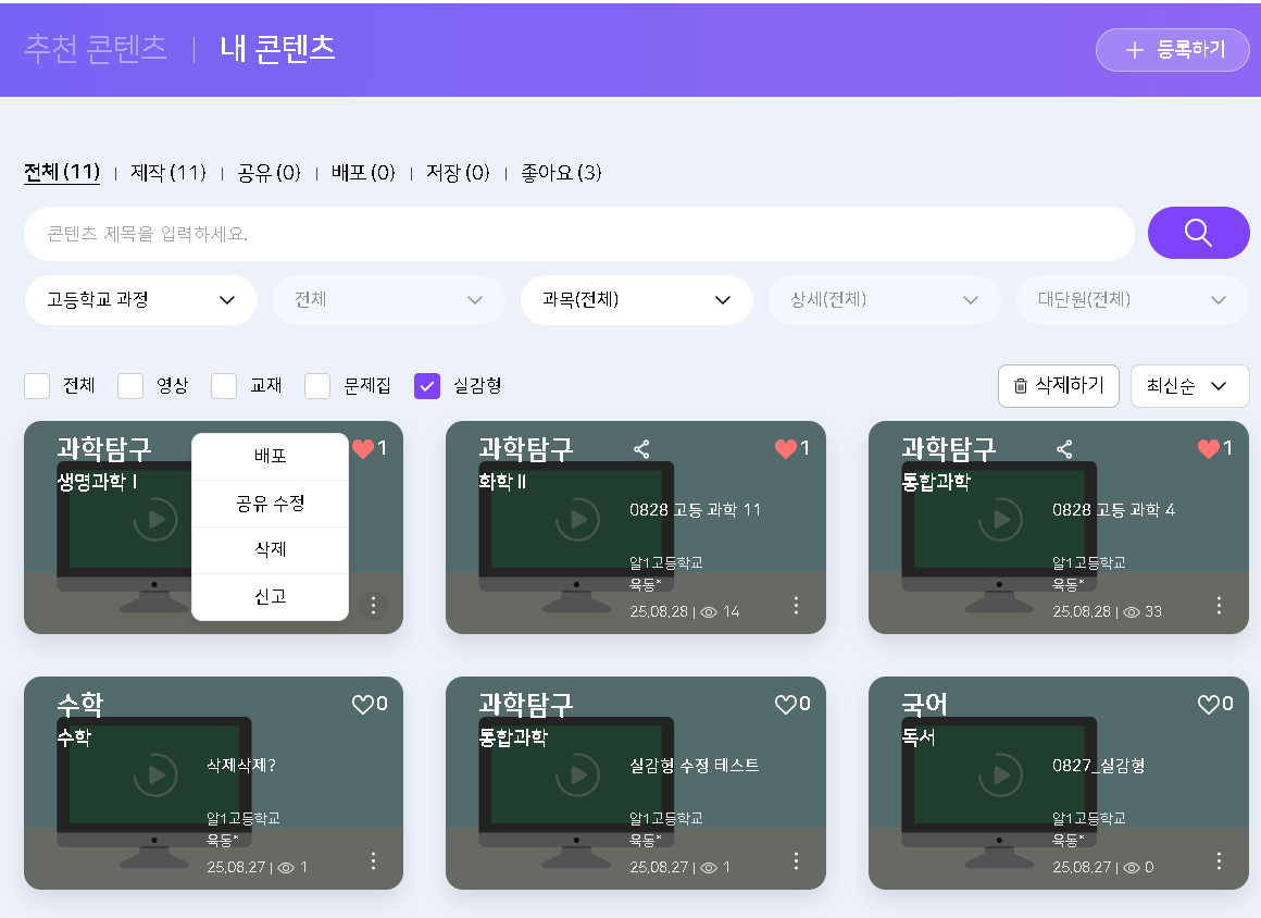 | Description | 내 콘텐츠 - 공유 설정 되어 있는데, 추천 콘텐츠 - 공유 안함으로 노출됨 1. 내 콘텐츠 - 공유 설정 되어 있는데, 추천 콘텐츠 - 공유 안함으로 노출됨 -> 문제 2. 내 콘텐츠에서 전체 공유로 설정 : 추천 콘텐츠 - 통합검색, 실감형 - 실감형 영상 더보기 클릭시 수정 버튼이 노출됨 -> 문제 (공유 설정 되어 있는 상황에선 콘텐츠 수정 미노출) | ||||