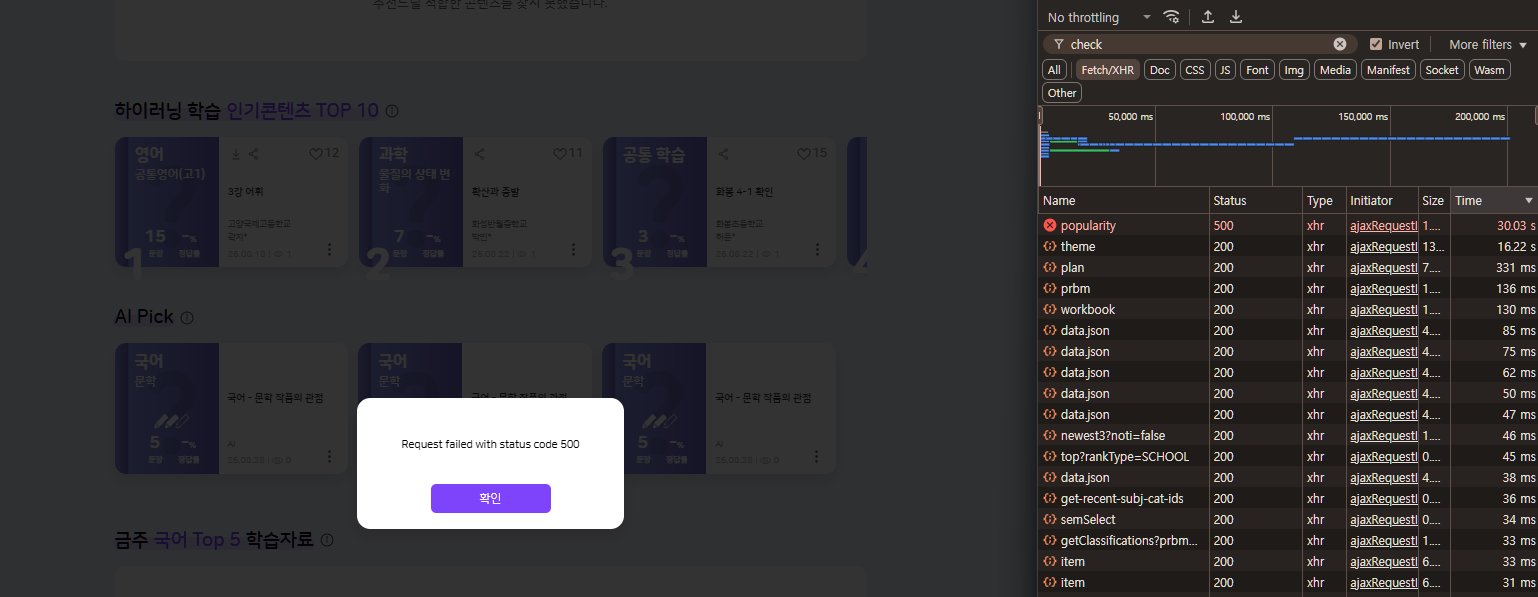 | Description | 추천 콘텐츠 - popularity 500에러, theme 15s 지연 - 하이러닝 학습 인기콘텐츠 TOP 10 : 15초 지연 - AI Pick : 리스트 노출되지만 500에러 | ||||