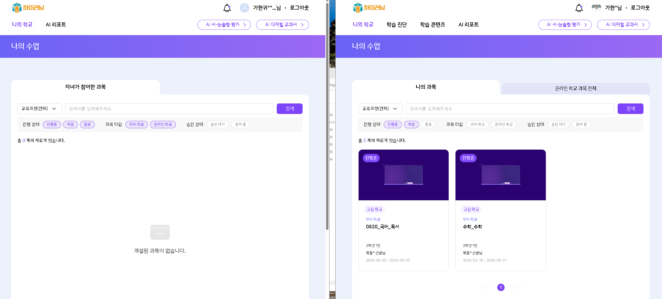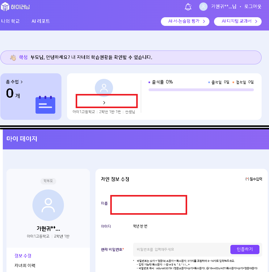 | Steps To Reproduce | 학부모 로그인 > 메인 페이지 응시 > 나의 학교 > 나의 수업 > 응시 | ||||