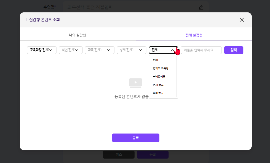 | Description | 타교사가 올린 실감형 콘텐츠 조회 시, 필터가 잘못됨 *기대 결과 : 전체, 경기도 교육청, 커넥트에듀, 전체 학교, 우리 학교로 노출되어야 함 | ||||