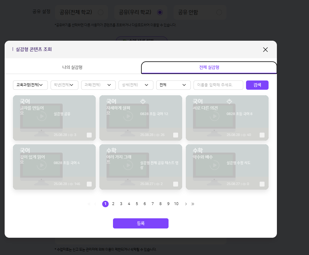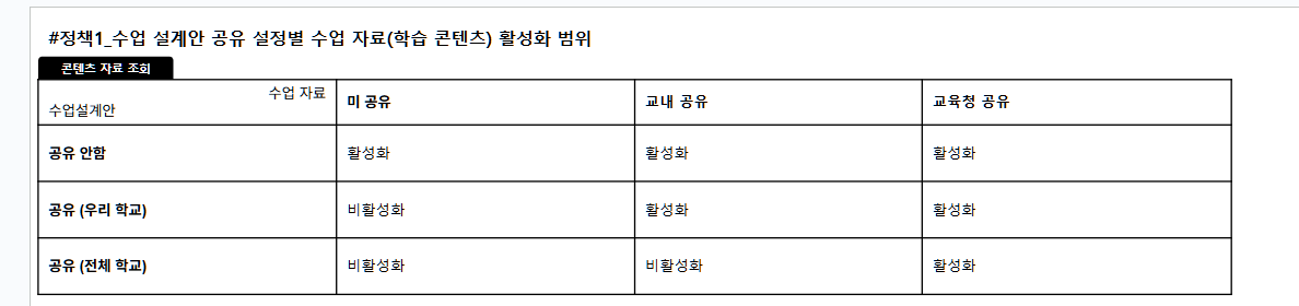 | Description | 수업 설계 - 실감형 > 콘텐츠 조회가 정책과 상이함 - 수업설계안이 우리학교 공유로 설정되어 있으나 교내, 교육청 공유(전체 실감형에 노출되는) 콘텐츠가 비활성 처리 | ||||