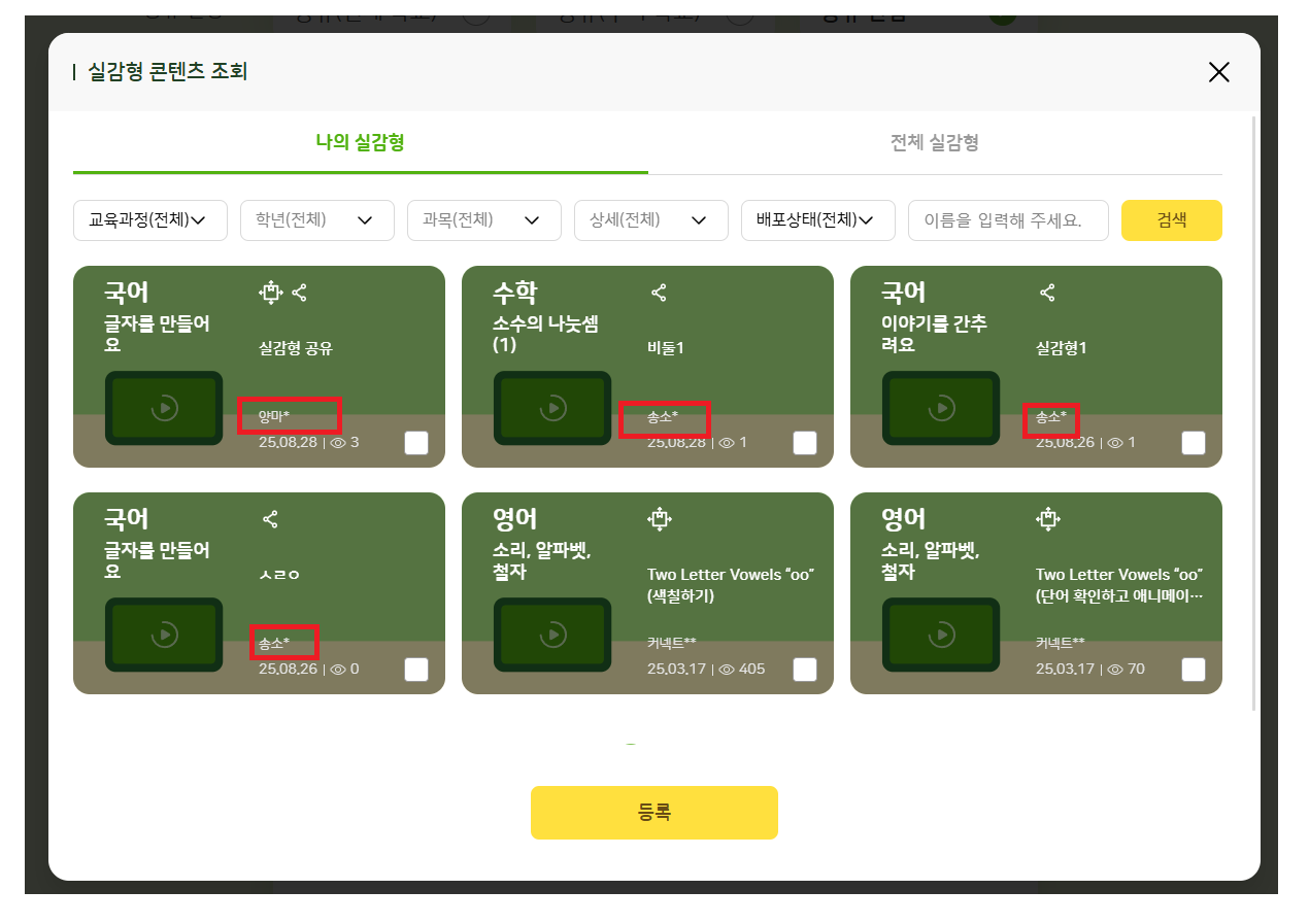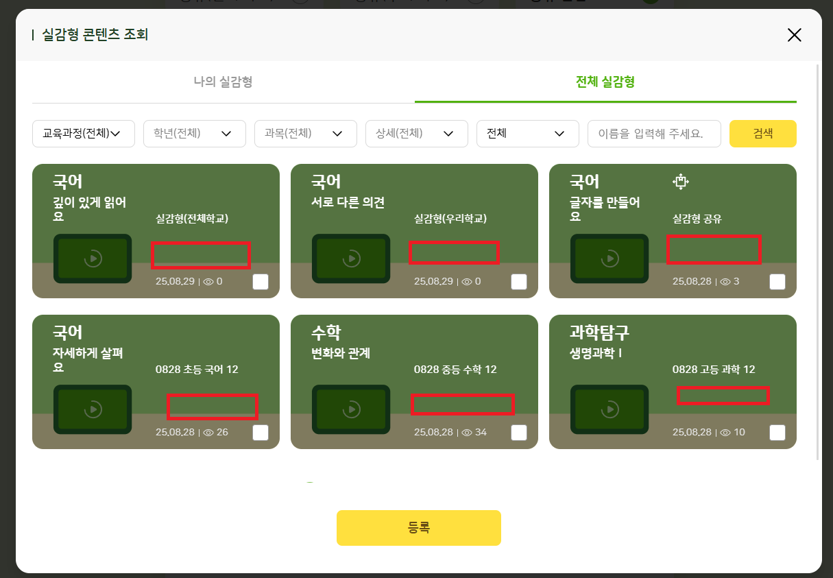 | Description | 기대결과 나의 실감형 탭 : 학교, 교사명 전체 실감형 탭 : 학교, 교사명 TB 나의 실감형 탭 : 교사명 전체 실감형 탭 : 아무것도 없음 | ||||