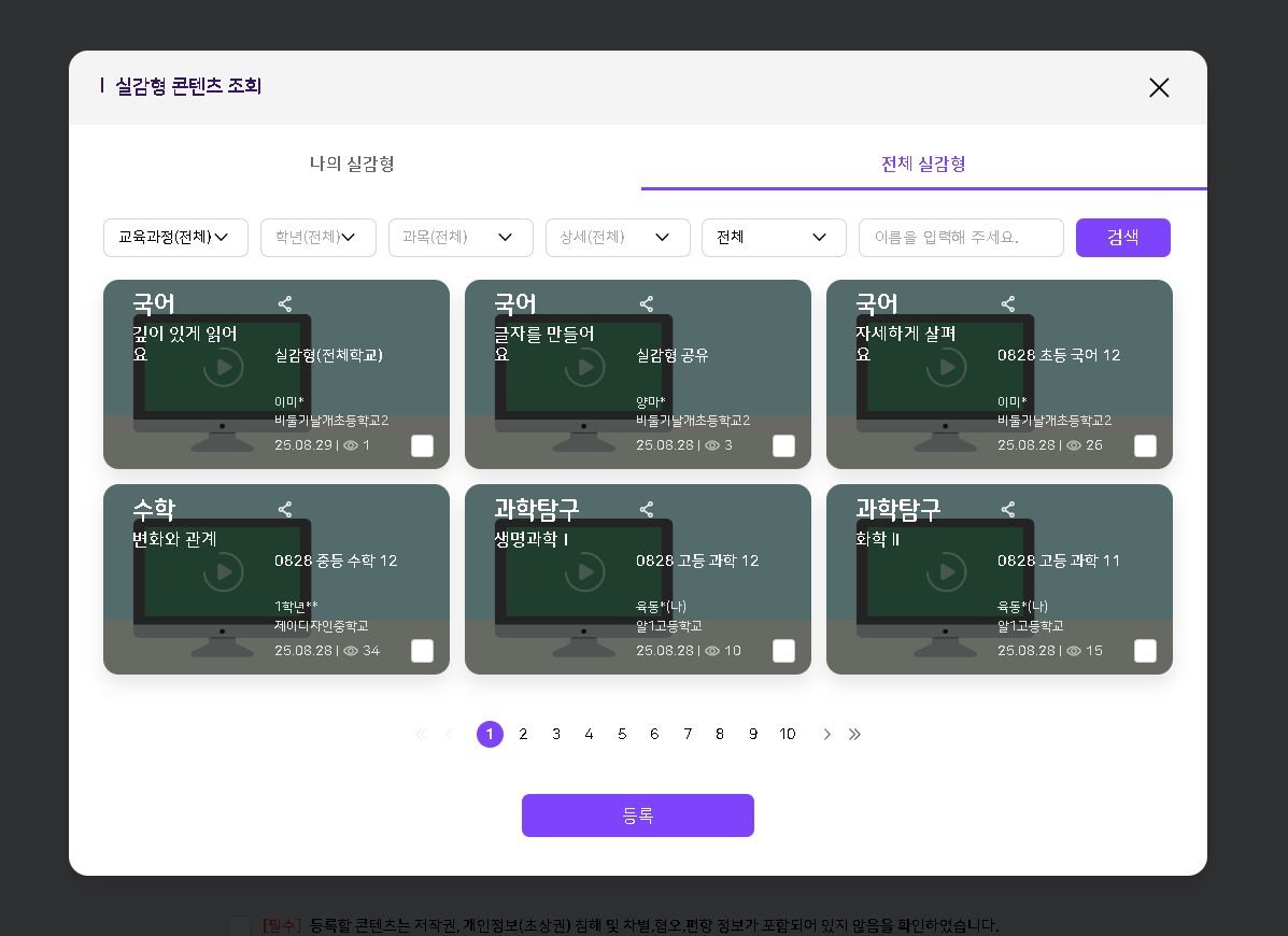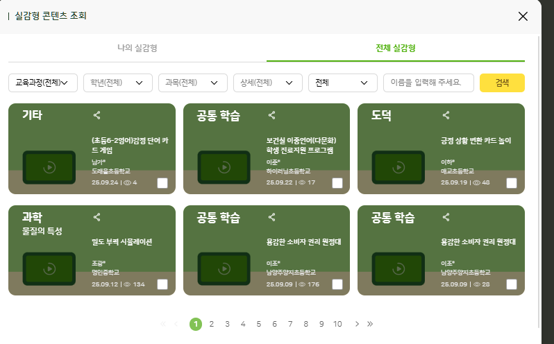 | Steps To Reproduce | 1. 교사 로그인 2. 등교 수업 설계 > 실감형 콘텐츠 조회 > 나의 실감형 탭/전체 실감형 탭 | ||||