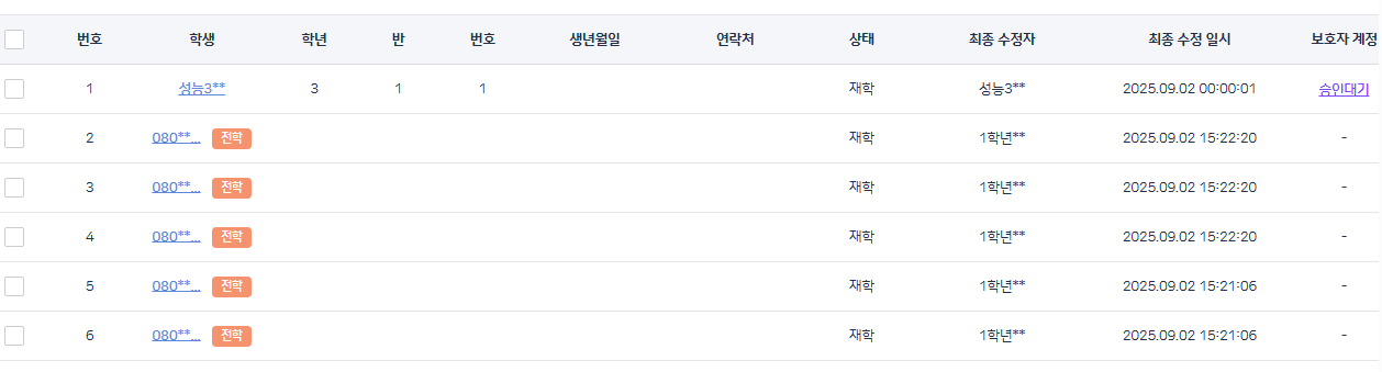 | Additional Information | 성능중 : 25test1 080** 학생 확인 (25.09.02 15:22:20) 전출 시점 | ||||