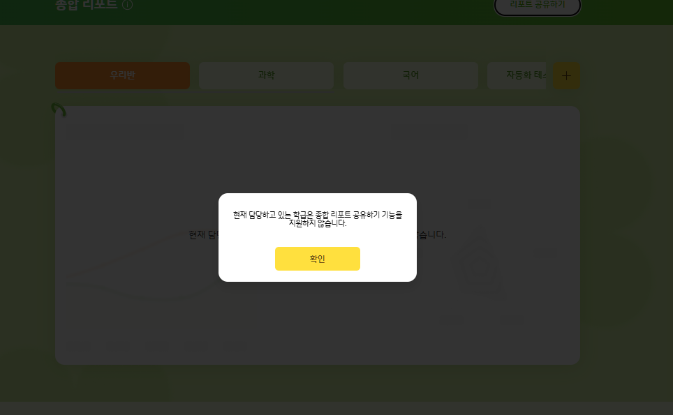 KT LanEdu_화면설계서_01.main&report > TEA-AIR-SYN-010, STU-AIR-002 Case 1. 정규과정 외에 학급을 배정 받은 담임 정규과정 (초1~6 , 중 1~3 , 고1~3) 이외 학급에 속한 학생 대상 (예 : 중학교 4학년,고등학교 4학년 등등..) Case2. 초등학교 1/2/3학년 담임 교사인 경우 위 케이스의 경우 종합리포트 기능을 제공하지 않습니다. 이 케이스에 '리포트 공유하기' 버튼 클릭 시, alert '현재 담당하고 있는 학급은 종합 리포트 공유하기 기능을 지원하지 않습니다.' 노출 적용 부탁드립니다. @개발팀, 위와 같이 적용가능할까요? |