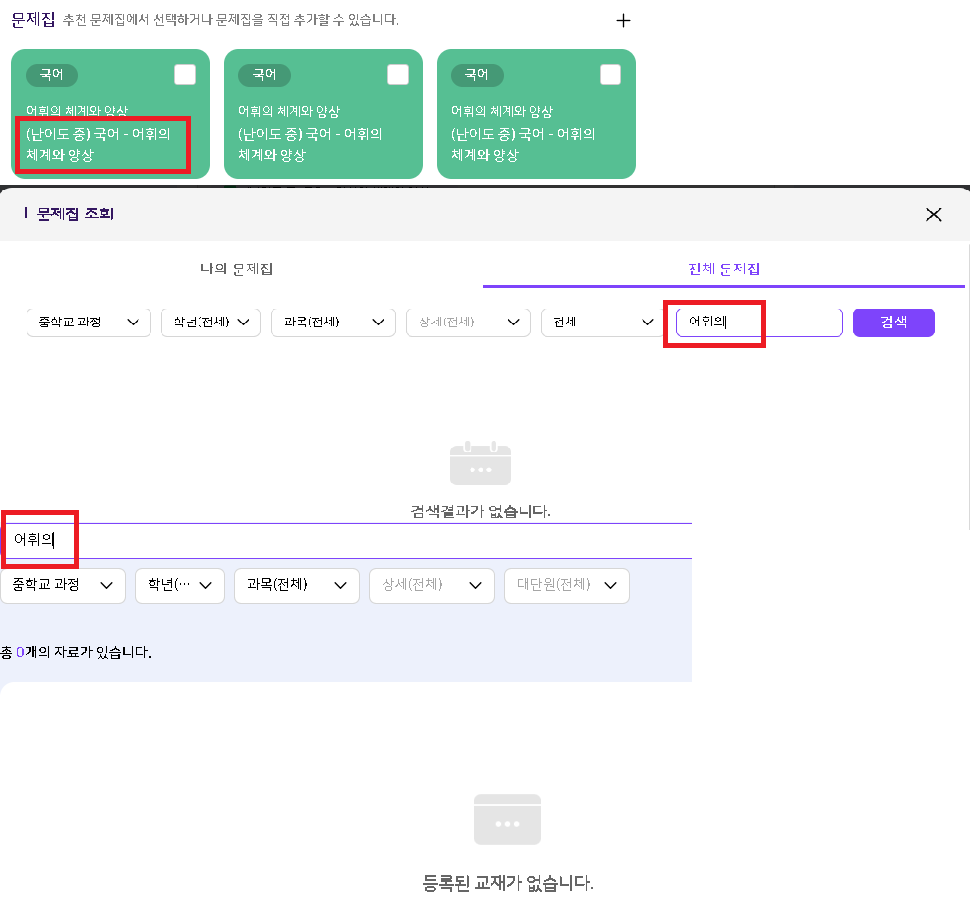 | Steps To Reproduce | 1. 나의 학교>나의 수업>과목 상세>수업 설계하기 2. 추천 문제집에서 노출된 문제집을 문제집 직접 등록하기에서 검색 2. 추천 문제집에서 노출된 문제집을 학습콘텐츠>교재에서 검색 | ||||