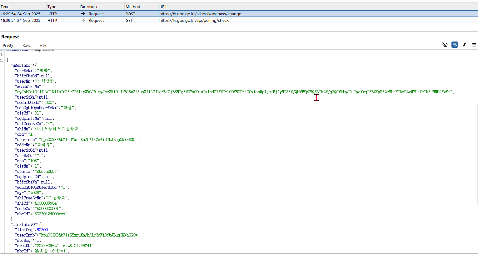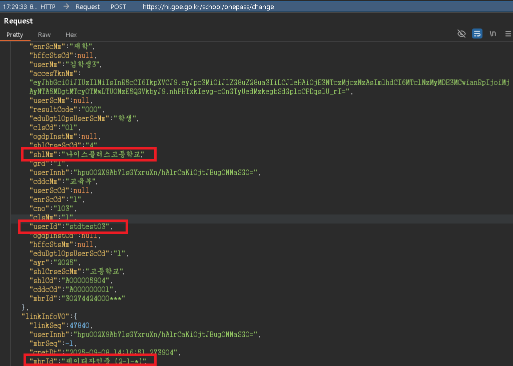 | Description | /school/onepass/change 학생 원패스 밀어내기 시 학생 계정 정보 노출 | ||||