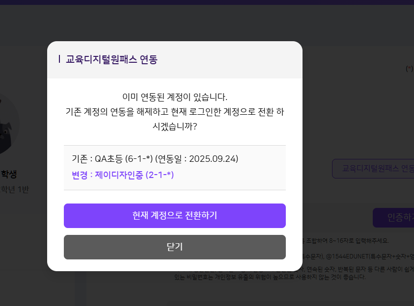 | Steps To Reproduce | 1. A 계정 디지털 원패스 연동 2. B 계정 동일한 디지털 원패스 연동 3. 교육디지털원패스 연동 팝업 노출타이밍에 API인터셉트 4. /school/onepass/chang API 확인 | ||||