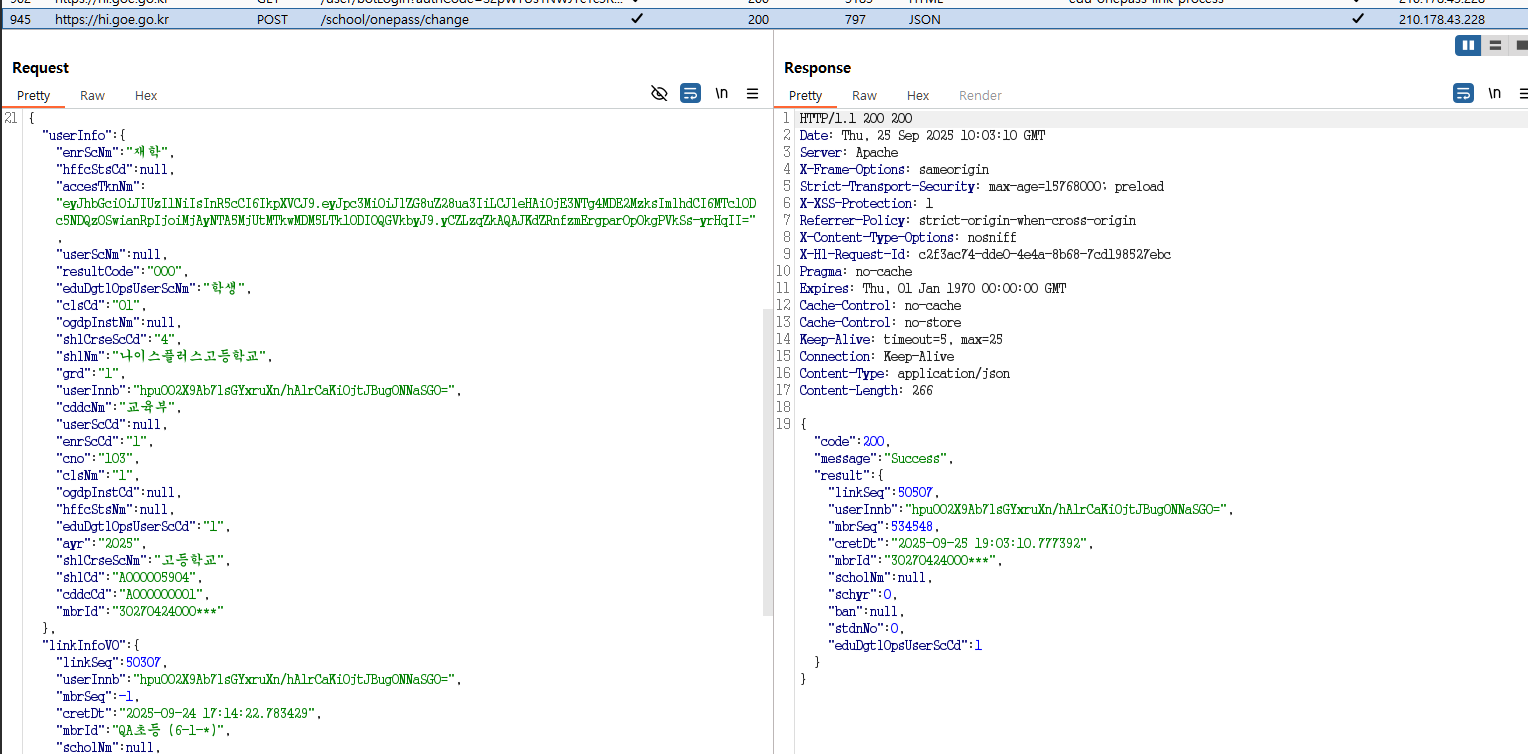 | 2025-09-24 09:36 | 김소원 | Summary | /school/onepass/change 원패스 연동하기 시 학생 데이터 노출되는 현상 => /school/onepass/change 학생 원패스 밀어내기 시 학생 계정 정보 노출 |