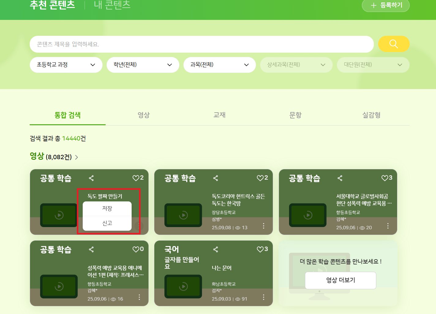 | Steps To Reproduce | 1. 교사 로그인 2. 학습 콘텐츠 > 통합 검색 > 영상 : '독도 팔짜 만들기'에 더보기 클릭 3. 교재 탭으로 이동 4. 다시 통합 검색 탭으로 이동 > 영상 : '독도 팔짜 만들기' 확인 | ||||