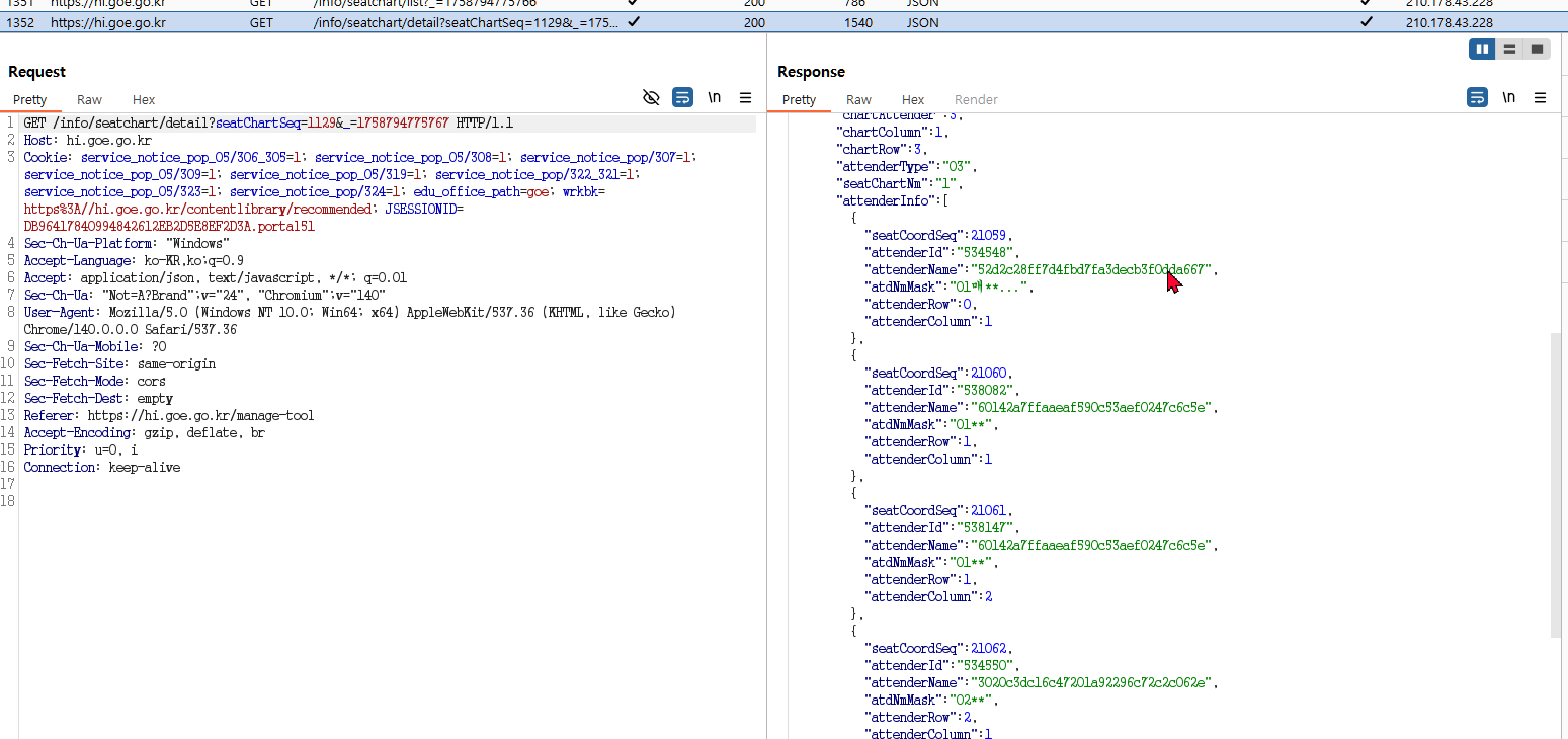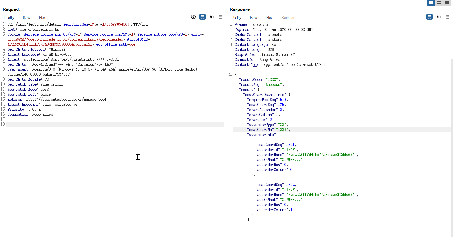 | Description | /info/seatchart/detail?seatChartSeq 학급 경영도구 - 학생 정보 노출됨 | ||||
