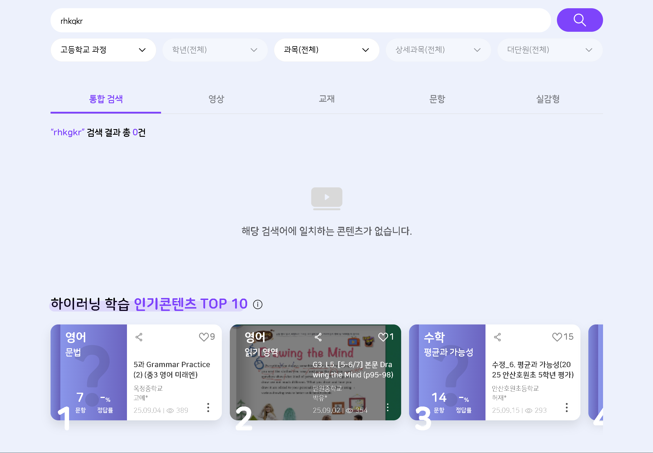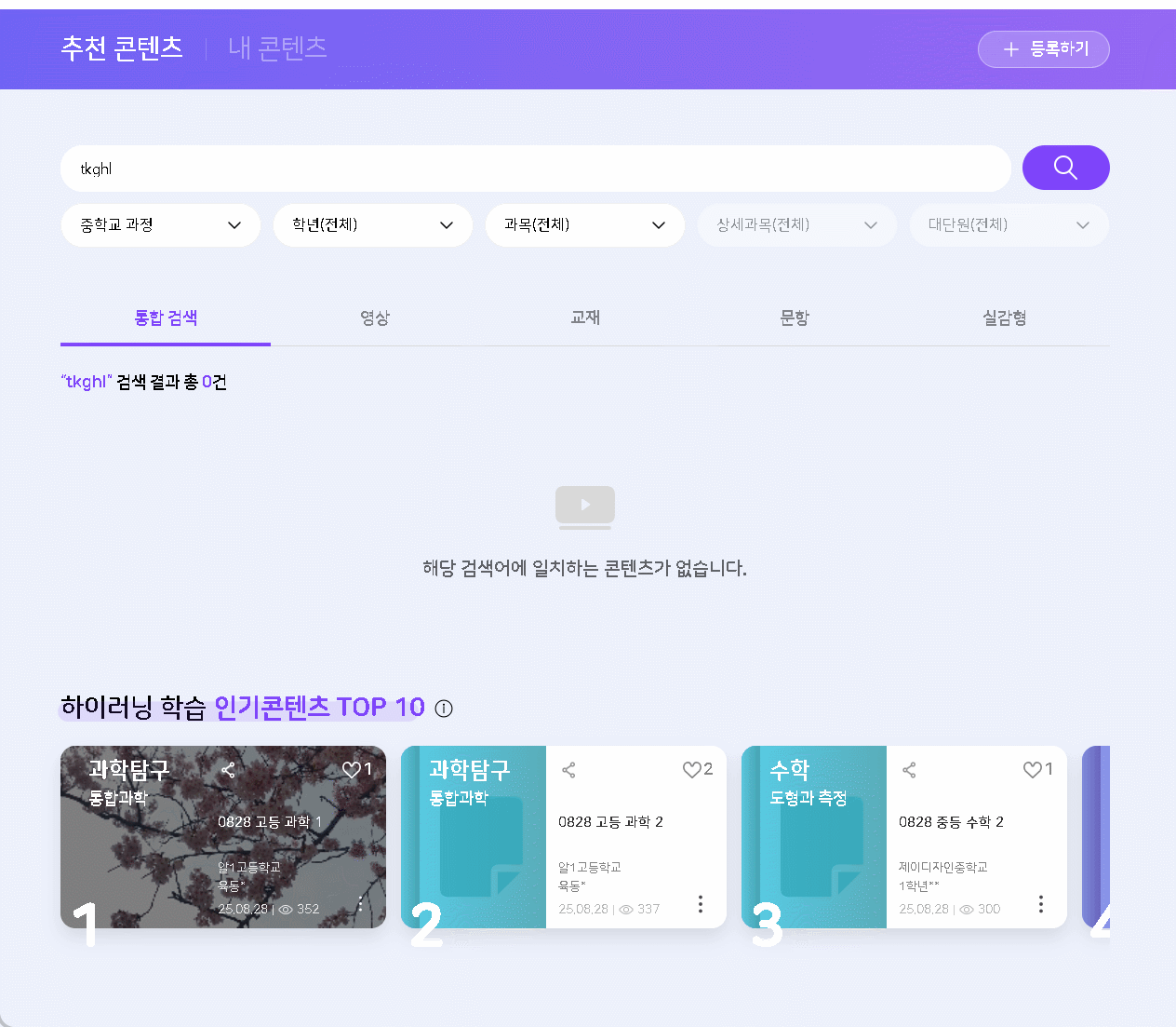 | Steps To Reproduce | 1. 추천 콘텐츠 > 검색 결과가 있는 단어 검색 2. 검색 결과 없을 만한 단어 검색 3. 하이러닝 학습 인기 콘텐츠 TOP 10 스크롤 시도 | ||||