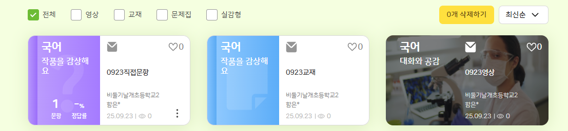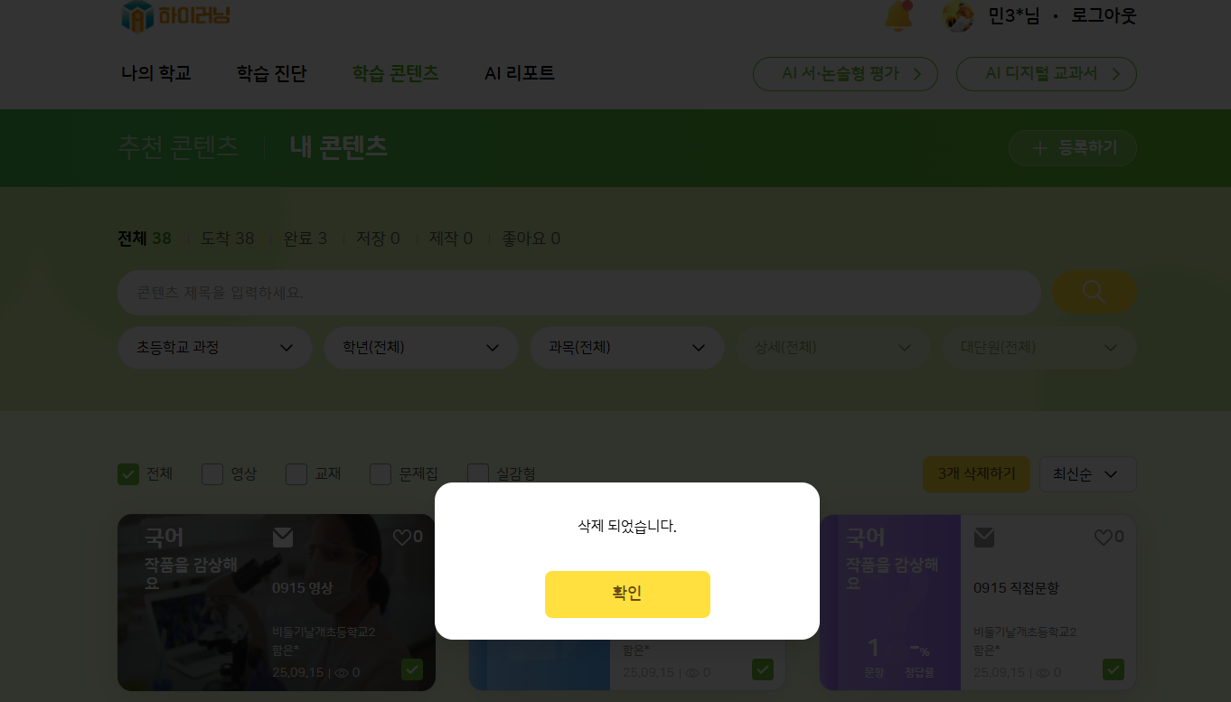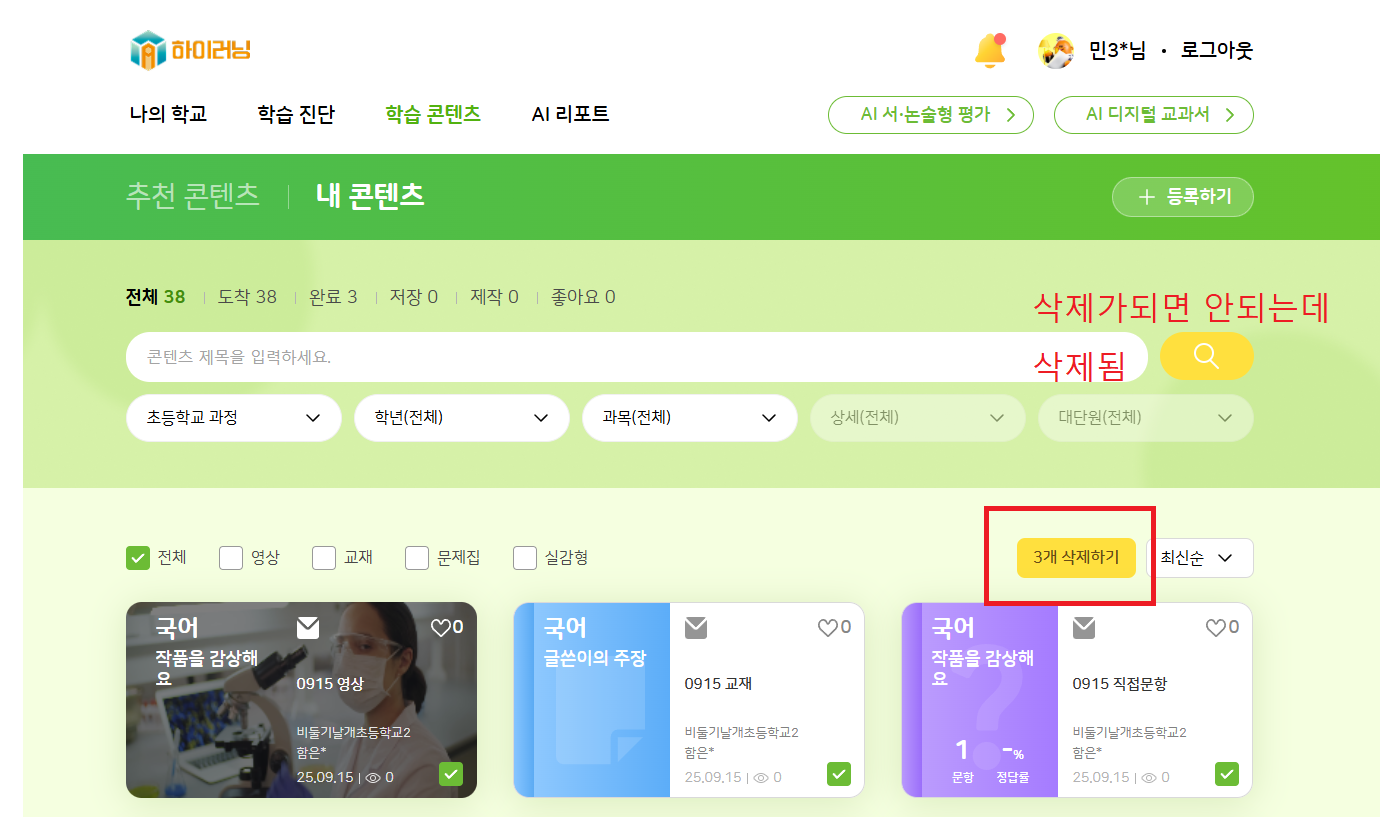 | Steps To Reproduce | 1. 교사 로그인 2. 학습 콘텐츠에 새로운 영상/교재/문항 등록 3. 위의 콘텐츠를 수업에 포함하여 등교수업 생성 4. 학생 로그인 > 내 콘텐츠 진입 > 수업으로 인해 배포된 영상/교재/문항 삭제 시도 | ||||
