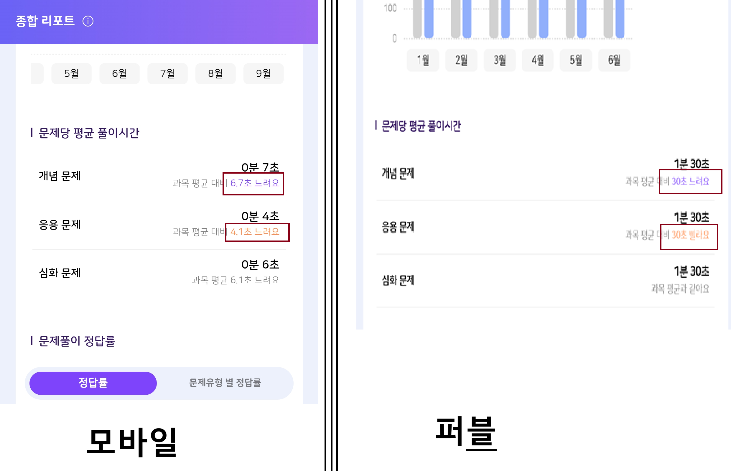 | Description | 모바일-학부모-종합리포트 : 문제당 평균 풀이시간 색사용이 상용과 다른 현상 | ||||