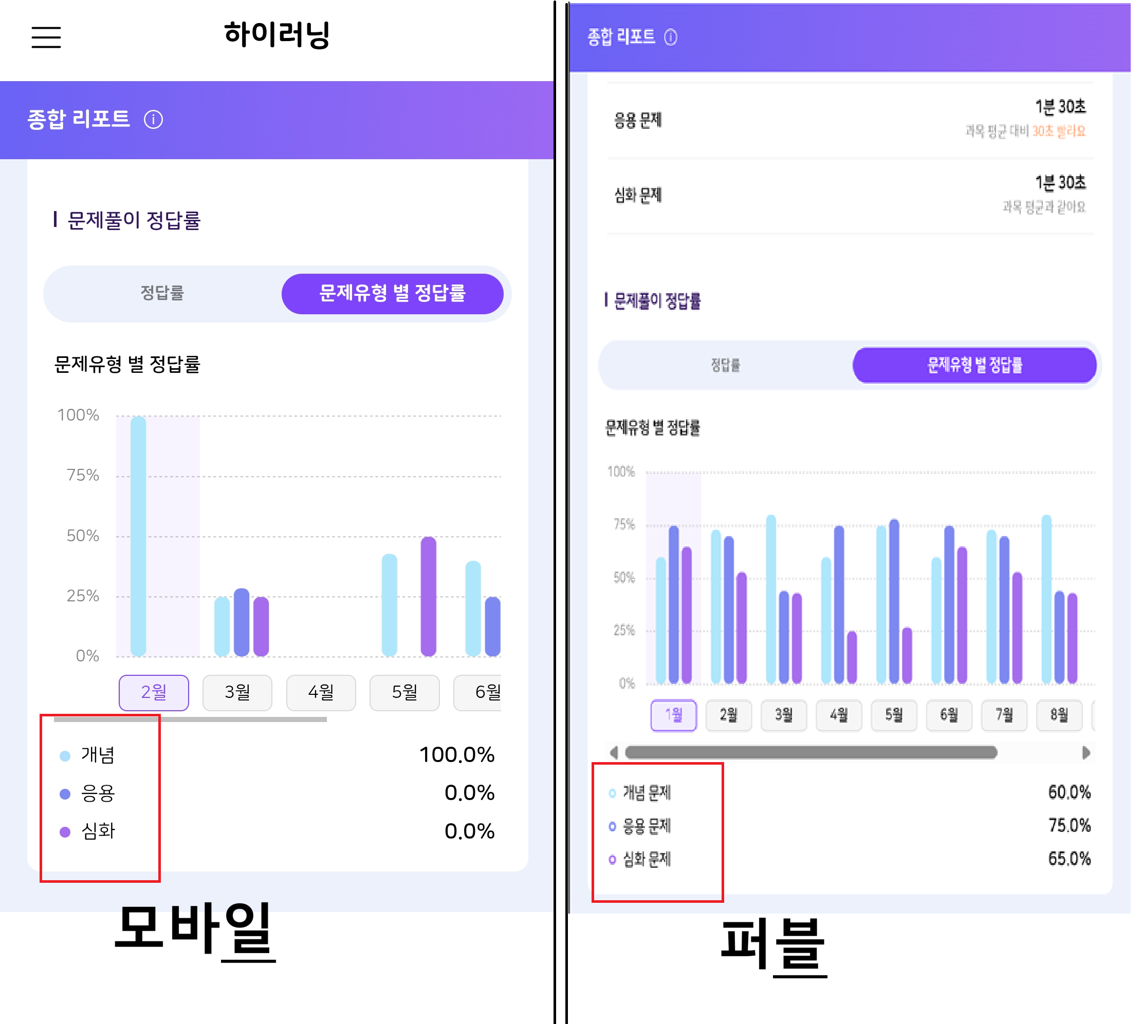 | Description | 모바일-학부모-종합리포트 : 문제풀이 정답률 개념|응용|심화 텍스트 퍼블과 상이 퍼블 : 개념 문제, 응용 문제, 심화 문제 TB-모바일 : 개념, 응용, 심화 | ||||
