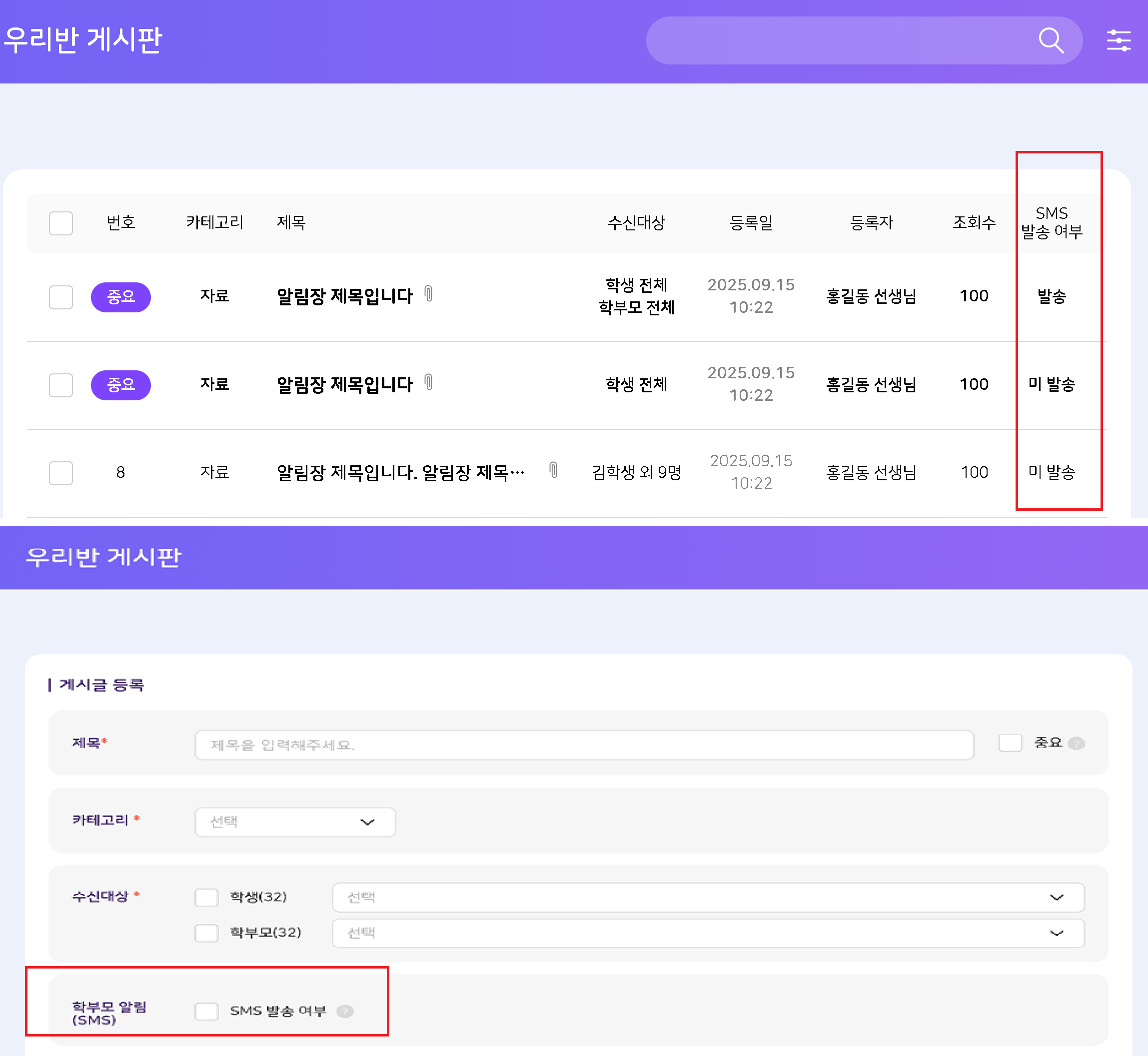 | Description | 모바일 - 우리반 게시판에 학부모SMS 발송 여부 적용 문의드립니다. PC : 1. SMS 발송 여부(발송,미발송), 2. 호버시 발송 이력 노출 3. 우리반 게시판 등록/수정 화면에서 발송여부 체크 노출 인데 모바일에서는 어떻게 되어야하는지 문의 드립니다. (sms 발송은 PC 버전에서만 가능하다는 정책은 들었지만 보내는 기능 이외에 발송 여부 표기는 어떻게 되어야 하는지 문의드립니다.) | ||||