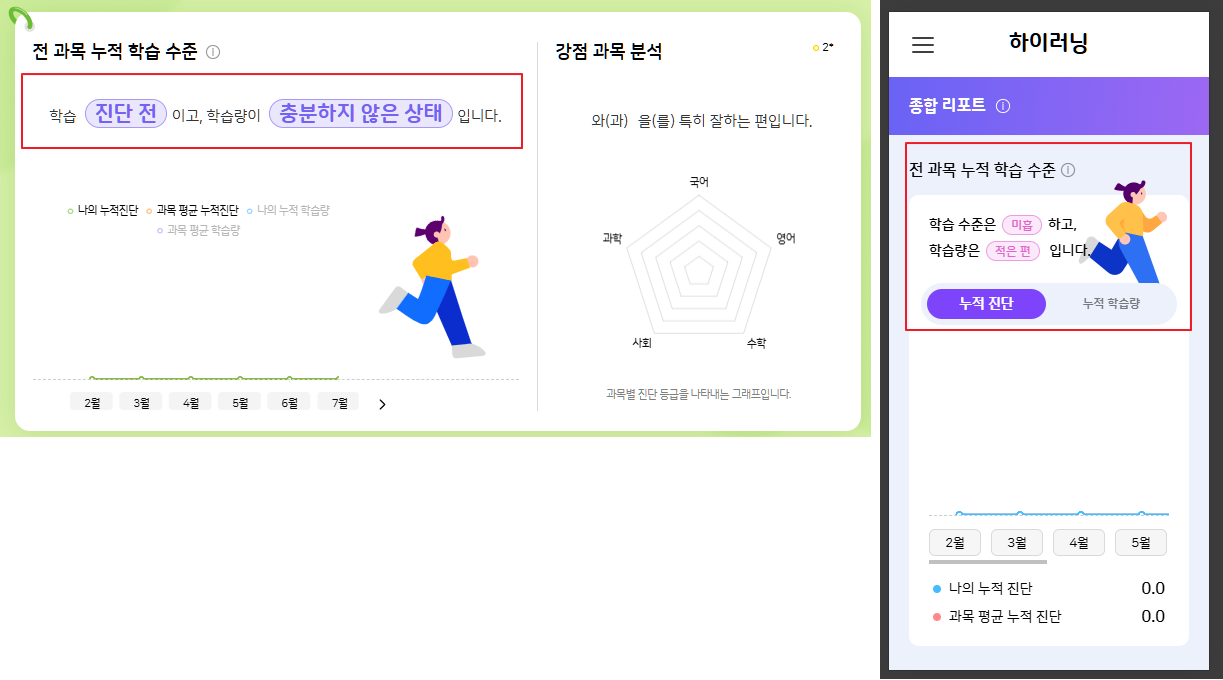 | 2025-09-19 04:31 | 김소원 | Summary | 학생/학부모 종합리포트 > 전 과목 누적 학습 수준의 문구가 PC/모바일 상이한 현상에 대한 기획 문의 => 학생/학부모 종합리포트 > 전 과목 누적 학습 수준의 문구가 PC/모바일 상이한 현상 |