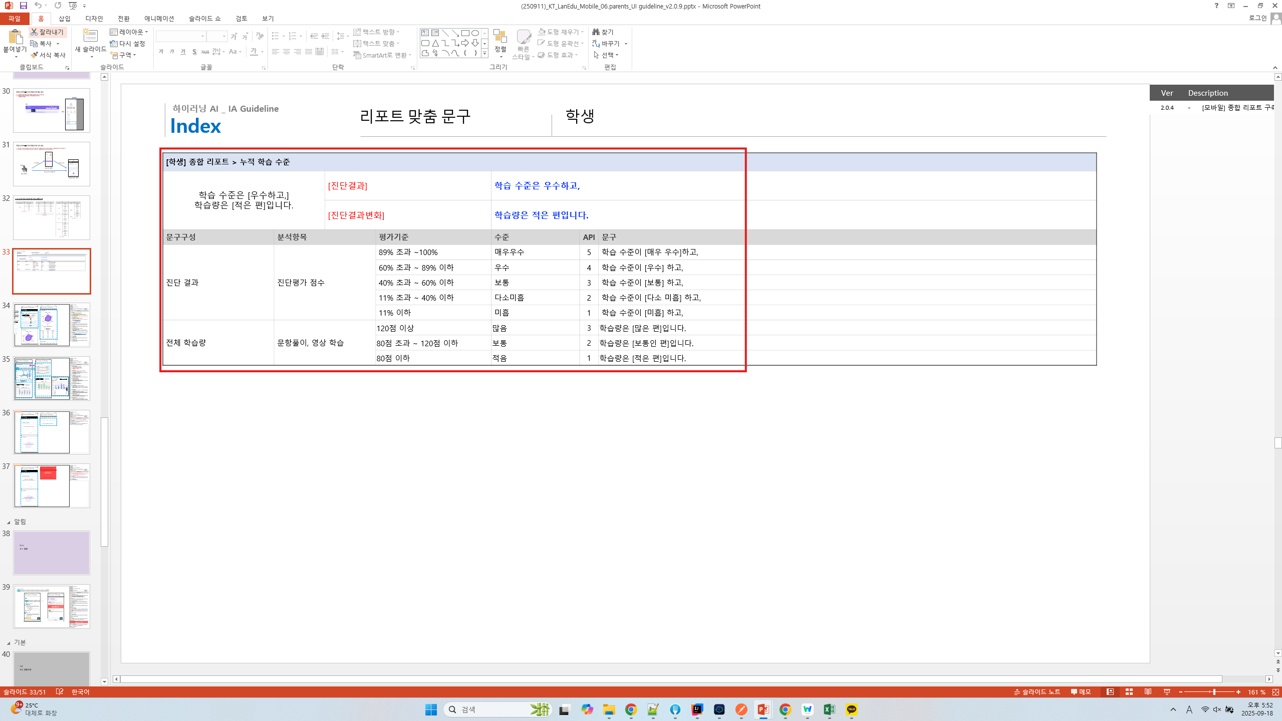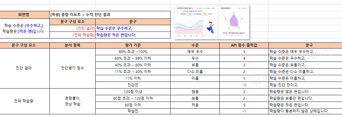 기획서 : (250911)_KT_LanEdu_Mobile_06.parents_UI guideline_v2.0.9.pptx 페이지 : 33p ~ 34p 모바일 리포트 기획서에는 학습량이 적을 때, '학습량은 적은 편입니다.' 학습전 일때, '학습량이 충분하지 않은 상태입니다.' 에 대한 기획이 없습니다. 기획서 확인 부탁드립니다. |