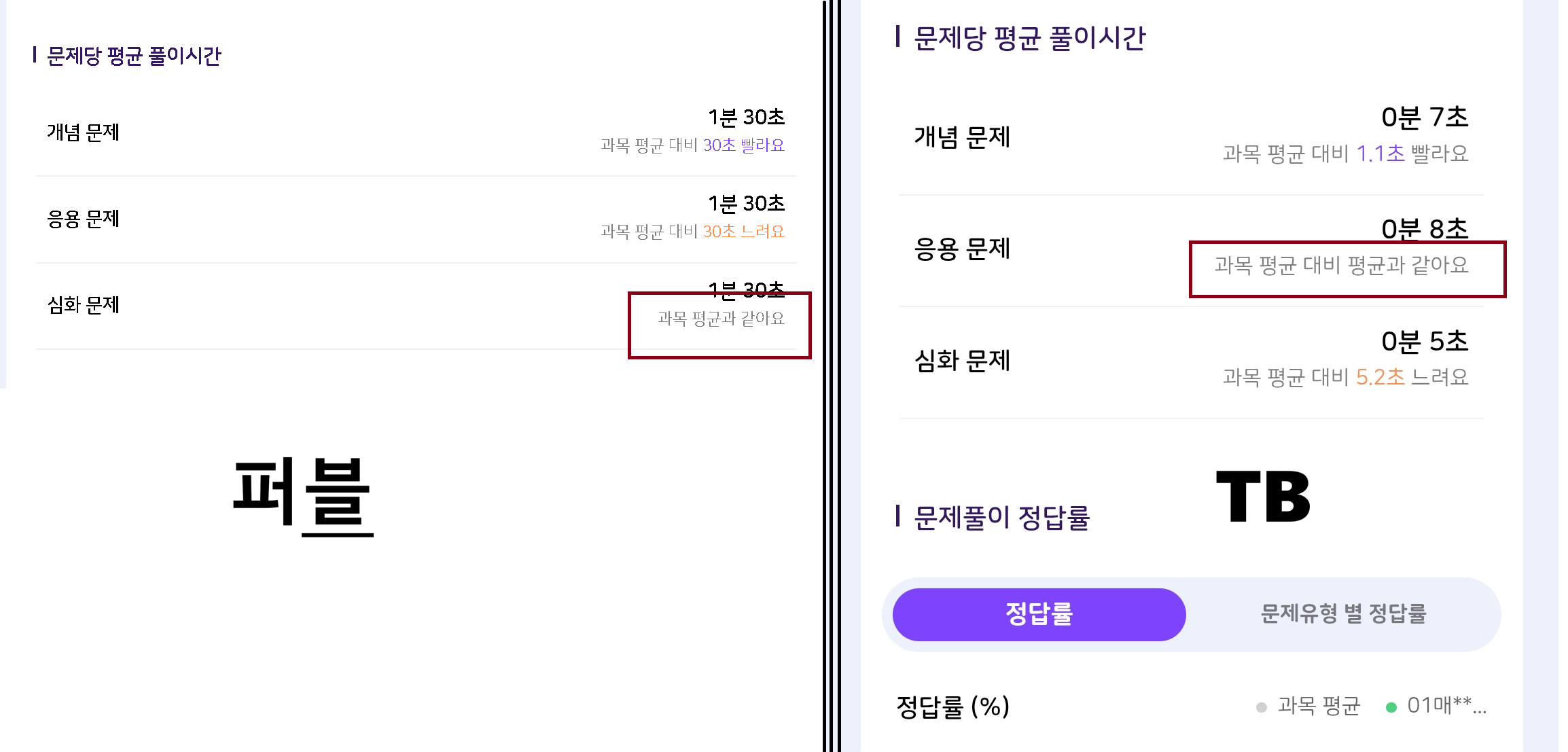 말씀 주신 것을 적용하면 현재 TB : 비둘기날개초등학교2 6-1-2의 학부모 확인 시, 심화 문제 옆에 문구는 과목 평균 2.5초 빨라요 (X) 과목 평균 대비 2.5초 빨라요 (O) 라고 수정되어야 할 것 같아 reopen 하겠습니다 |