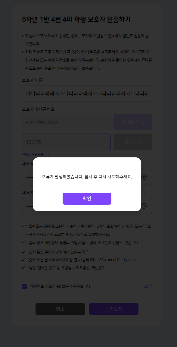 | Description | 학부모 회원가입 시, 보호자 이름 글자수 제한이 없는 현상 *글자수 제한이 없어서 100글자 넘어가게도 입력이 가능하며, [승인요청] 클릭 시 오류 팝업 노출 *학생/교사 등록 시에는 이름에 대한 글자수 제한이 있음 -> 정상 | ||||