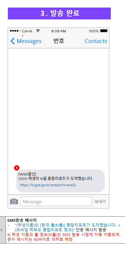 | 2025-09-18 04:06 | 이세희 | Summary | 학부모에게 모바일 종합리포트 SMS 전송 시, 문자 메시지 90바이트에 대한 기획 문의 => 학부모에게 모바일 종합리포트 SMS 전송 시, 문자 메시지 90바이트 이하에 대한 기획 문의 |