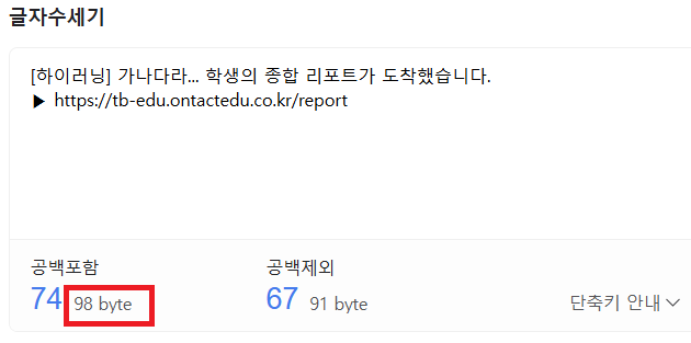 상용과 TB URL 이 달라서 바이트 차이가 나는 것 같습니다. 상용 기준 [하이러닝] 일이삼사...학생의 종합 리포트가 도착했습니다. ▶ https://hi.goe.go.kr/report 으로는 87byte인데 수정을 해야 할 까요? hi.goe.go.kr 와 tb-edu.ontactedu.co.kr 의 길이 차이입니다. |