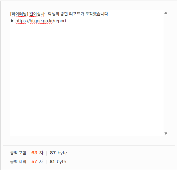 네. 줄바꿈과 기호 추가 해서 [하이러닝] 일이삼사...학생의 종합 리포트가 도착했습니다. ▶ https://hi.goe.go.kr/report 형식으로 개발하겠습니다. |