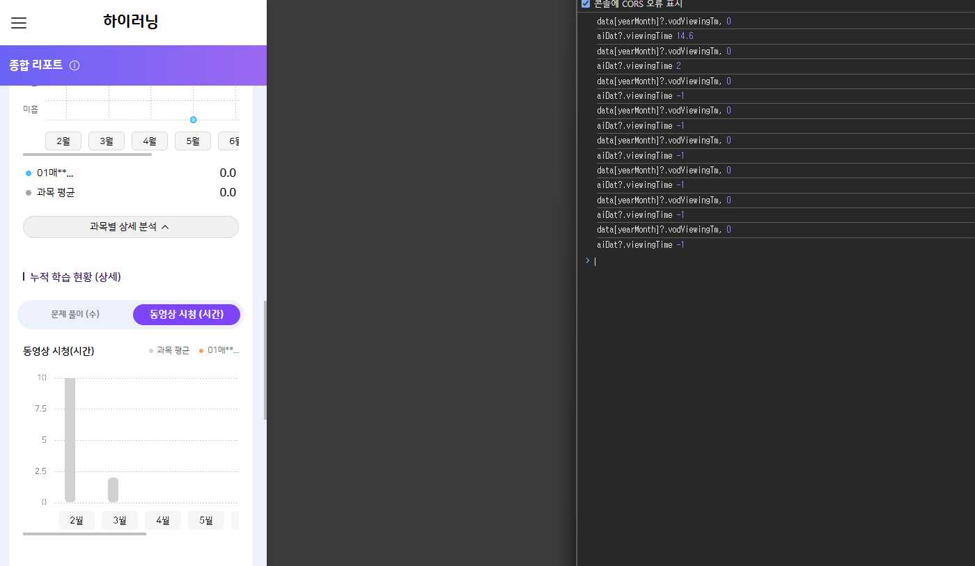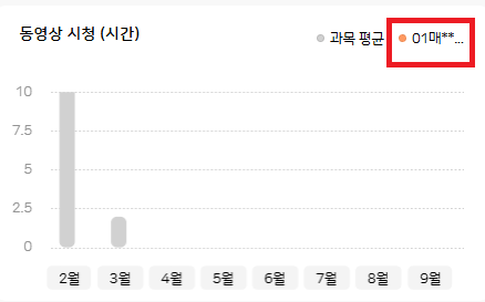 | Description | 학생/학부모 : PC/모바일 종합 리포트 > 동영상 시청(시간) 그래프에서 해당 학생 그래프가 노출되지 않는 현상 *과목 평균(회색 그래프)만 노출되고, 해당 학생(주황색 그래프)은 노출되지 않음 | ||||