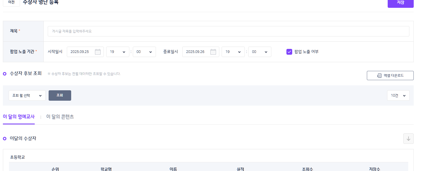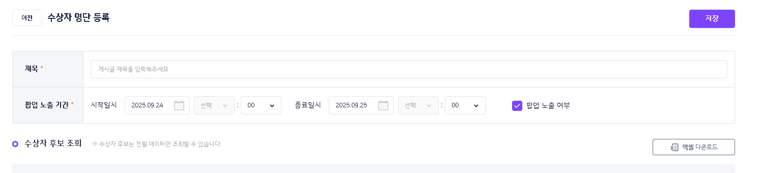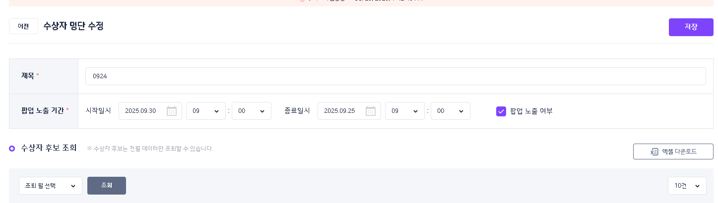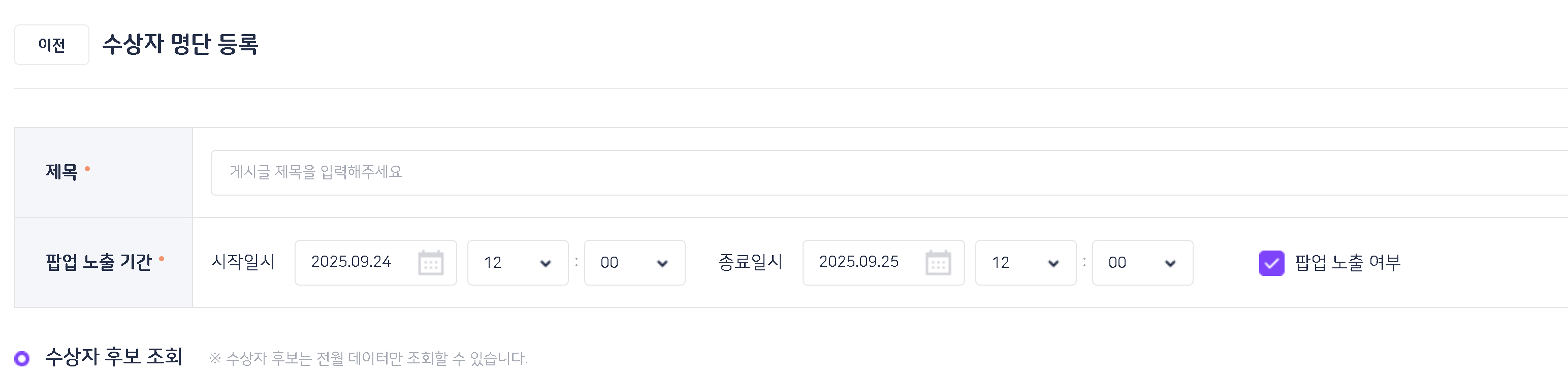 | Description | 수상자 명단 등록 시, 팝업 노출 여부 클릭했는데도 시작일시, 종료일시 default 값이 노출되지 않는 현상 *기대결과 : 현재 날짜 및 현재 시간(정시) ~ 내일 날짜 및 현재 시간(정시) *현재 TB 개발 : 미입력된 채로 노출 | ||||