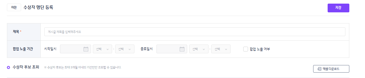 | Description | 기획 : ※ 수상자 후보는 전월 데이터만 조회할 수 있습니다. 현재 TB : ※ 수상자 후보는 최대 3개월 이내의 기간만만 조회할 수 있습니다. | ||||