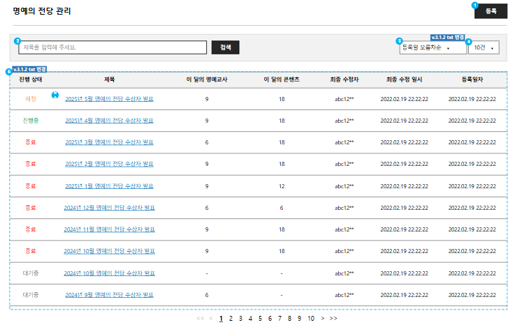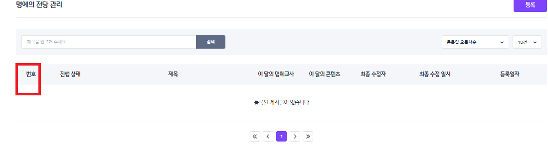 Description명예의 전당 관리 목록 - '번호' 컬럼 노출 여부 기획 문의